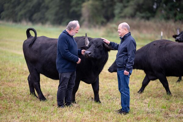 Бывший канцлер Германии Олаф Шольц с фермером и водяным буйволом во время посещения сельскохозяйственного природоохранного кооператива.