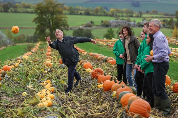 Лидер либеральных демократов Эд Дэйви собирает тыквы на фруктовой ферме Кэрни в Шотландии.