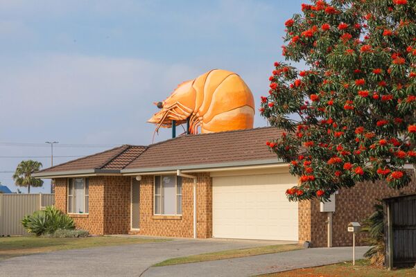 Знаменитая креветка Ballina, являющаяся частью коллекции Big Things, над магазином Bunning, Австралия.