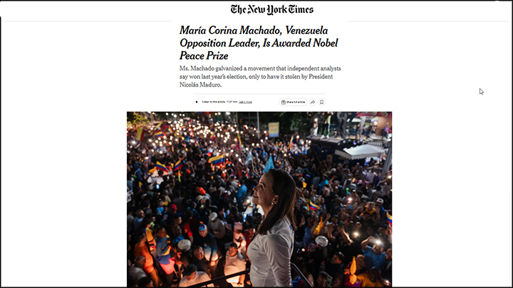 10 октября 2025 года Нобелевский комитет присудил Нобелевскую премию мира Марии Корине Мачадо "за её неустанную работу по продвижению демократических прав народа Венесуэлы и стремление к справедливому и мирному переходу от диктатуры к демократии". Мачадо посвятила премию "страдающему народу Венесуэлы" и Трампу — за "решительную поддержку нашей проблемы".
