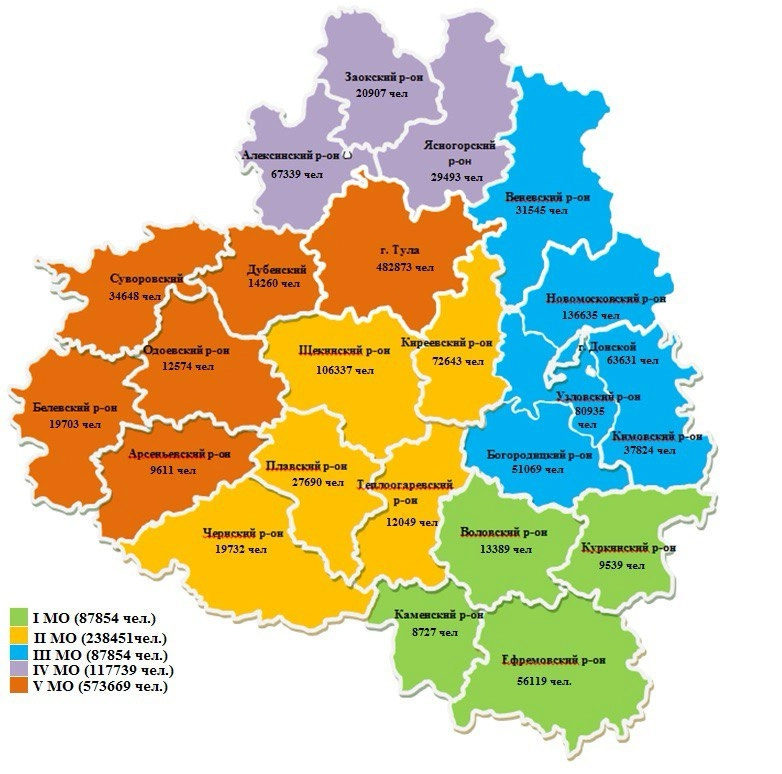 В Тульской области могут появиться медицинские округа, которые будут нарезаны с учётом численности, плотности и иных особенностей распределения населения, ориентируясь на среднюю численность населения не менее 75 тыс. человек в каждом округе, объединяющих несколько административных районов региона.
