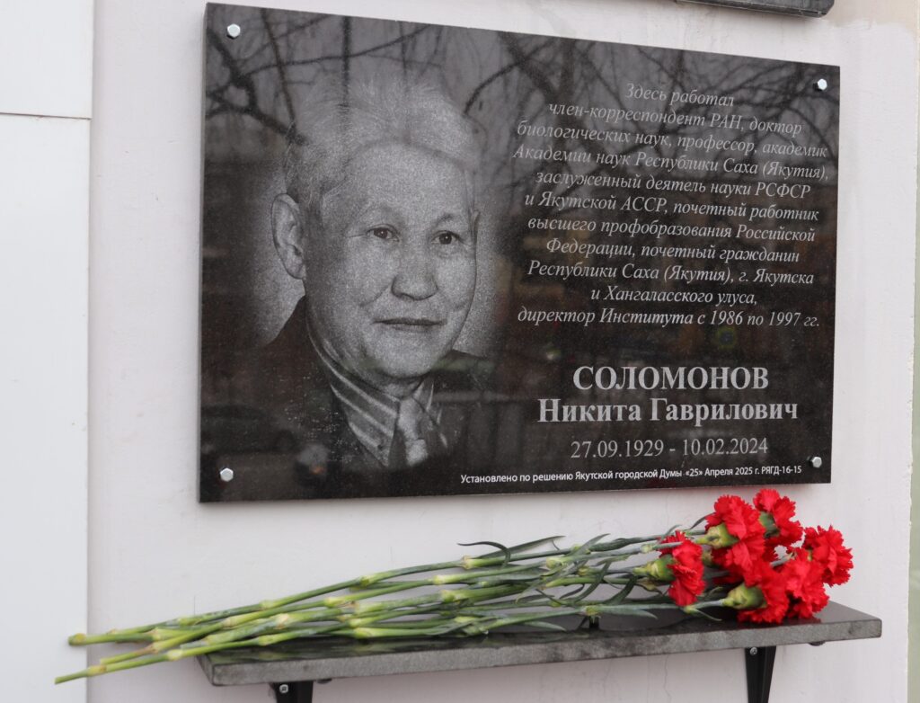 В Институте биологических проблем криолитозоны Сибирского отделения РАН-обособленном подразделении ФИЦ «Якутский научный центр СО РАН» состоялась торжественная церемония открытия мемориальной доски в честь выдающегося деятеля науки Якутской АССР и РСФСР, члена-корреспондента РАН, академика Академии наук Республики Саха (Якутия), Почетного гражданина Республики Саха (Якутия), городов Якутска и Хангаласского улуса, профессора, доктора биологических наук Никиты Гавриловича Соломонова.