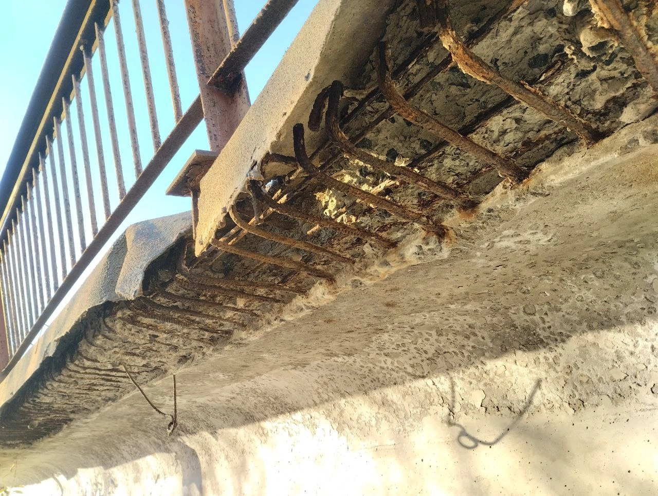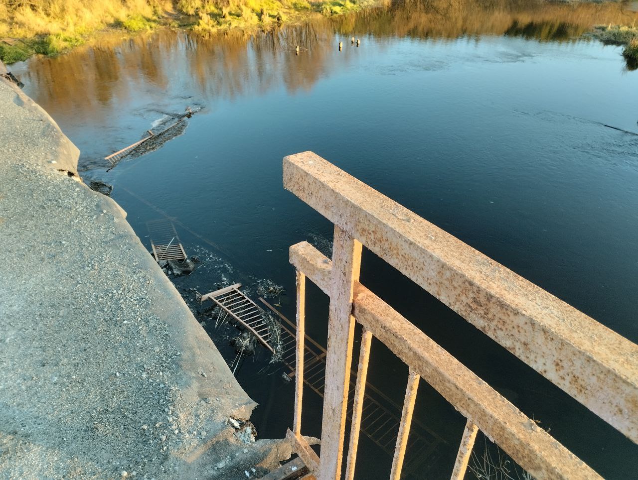 Две недели назад в реку упали металлические перила ограждения пешеходной дорожки. Арматура, на которой они держались, сгнила. Теперь часть пешеходной части моста - без защиты.