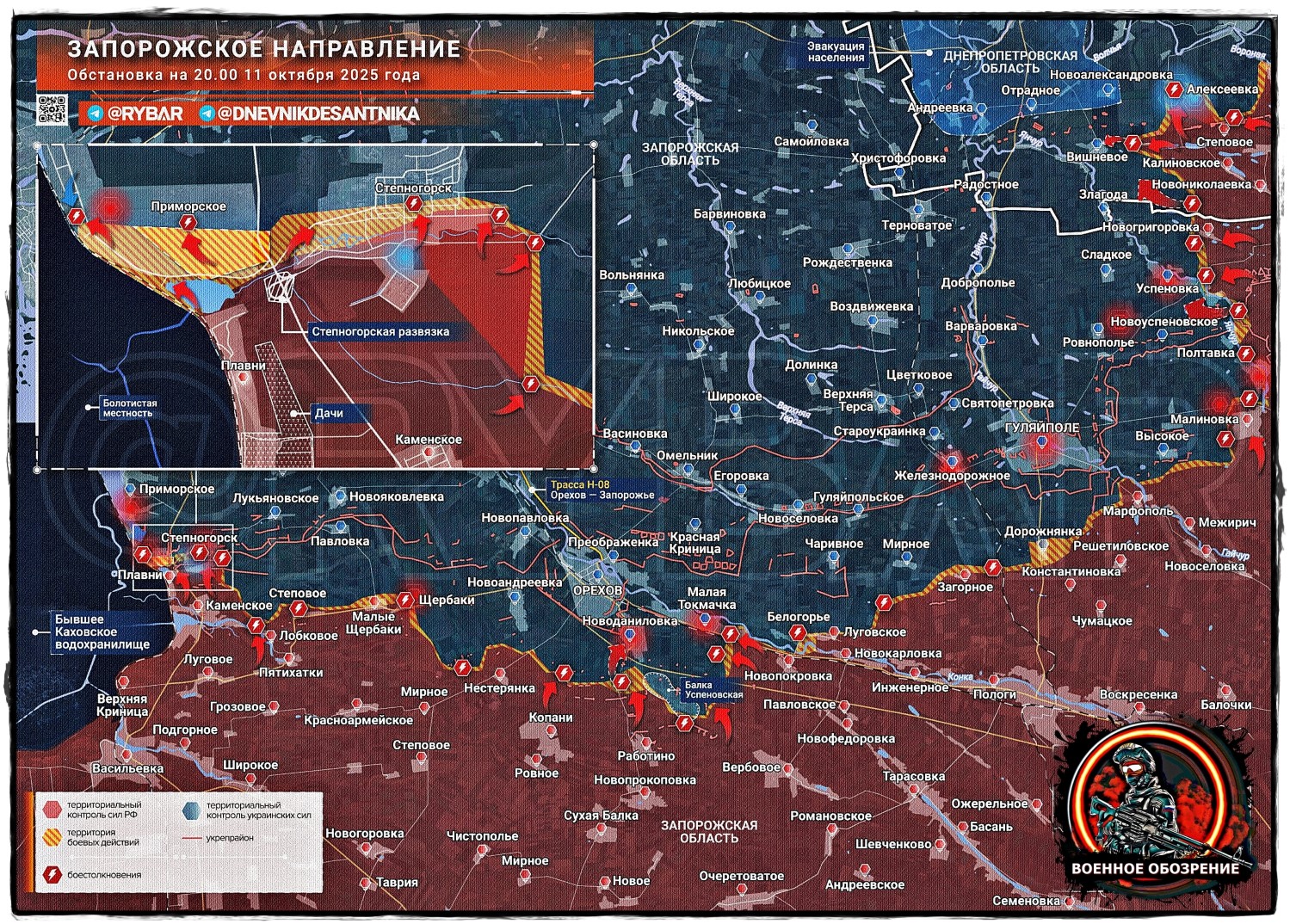 Согласно последним сообщениям, основная операция российской армии идёт одновременно в Запорожском направлении: линии Приморское–Степногорск находятся уже в руках штурмовых групп из РФ, расстояние до областного центра — около 20 км.