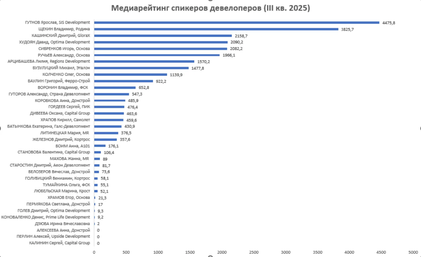 На третьей позиции оказался дебютант топ-3 президент GloraX Дмитрий Кашинский. Самыми популярными инфоповодами от этого спикера в III квартале 2025 года стали экспансия столичных девелоперов в субъектах РФ, реакция застройщиков на сокращение ключевой ставки, снижение объемов предложения первичного жилья в Санкт-Петербурге и Ленинградской области. Также медиа активно освещали IPO компании GloraX и ее участие в реализации проектов КРТ.