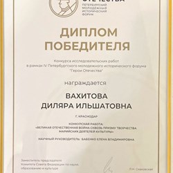 Студентки Краснодарского государственного института культуры стали победительницами конкурса исследовательских работ, который прошел в рамках четвертого Петербургского молодёжного исторического форума «Герои Отечества», посвященного 80-й годовщине Победы в Великой Отечественной войне 1941-1945 годов.