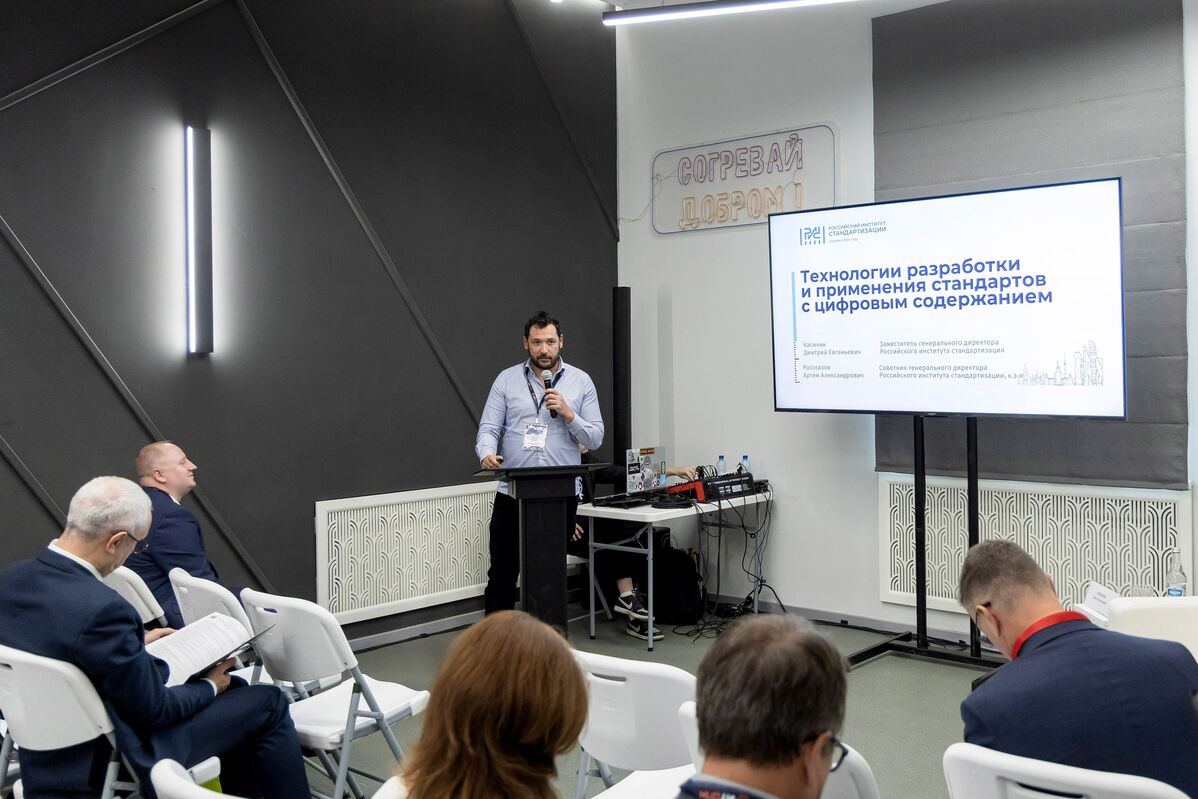Касичин Дмитрий, заместитель генерального директора Российского института стандартизации, в докладе «Технологии разработки и применения стандартов с цифровым содержанием» раскрыл понятие цифрового стандарта, рассказал о цифровом контейнере, эволюции стандартизации ISO, содержании представлений цифрового документа, принципах логической связанности представлений и решениях РИС.