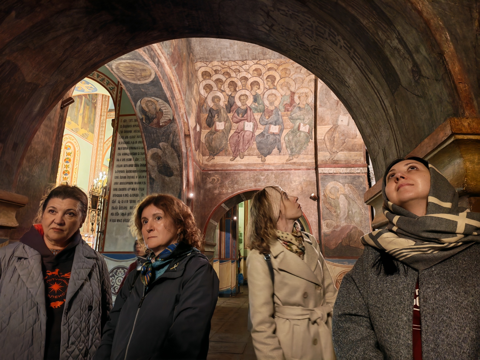 Наш поход начался с Успенского собора, где сохранились фрески, предположительно созданные Андреем Рублевым более 600 лет назад. Замечательный гид София так живо и увлеченно рассказывала об истории собора и его росписях, что ей-богу, мы ощутили себя современниками великих русских князей. Если не самого Авраама и других библейских персонажей, которым Рублев придал славянские черты, отойдя от византийского канона, сделав их ближе и понятнее. Заслушавшись и заглядевшись, чуть не опоздали в Дмитриевский собор. Однако нам, как гостям города, его любезно открыли музейные служители, так что успели мы и на чудом сохранившиеся фрески греческих мастеров посмотреть, и полюбоваться белокаменной резьбой храма, входящего в список Всемирного наследия ЮНЕСКО, как и Успенский. Кого только нет на рельефах! Грифоны, мифическая птица Алконост, грозные барсы и улыбающиеся львы, царь Давид, играющий на русских гуслях и основатель храма Всеволод Большое Гнездо, в крещении Дмитрий – отсюда и название собора. Лишь наступившая темнота заставила нас отправиться в гостиницу.
