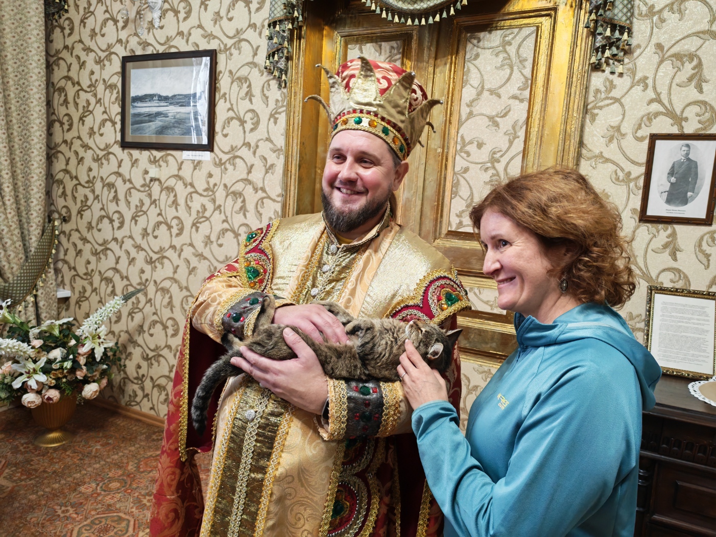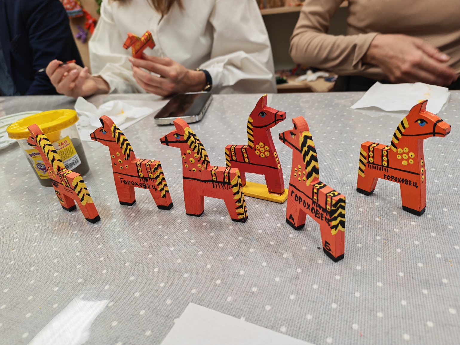 Судовладельцу Шорину принадлежал еще один примечательный дом в Гороховце – настоящий русский терем. Тут сейчас Дом народного творчества и ремесел и… палаты царя Гороха! Ученые не уверены, что название города и горох семантически связаны, но как не обыграть созвучие! С царем и его помощницами мы и гороховой каши-пучалки отведали, и загадки поразгадывали, и сплясали, и конечно, сделали селфи. И котейку погладили. Потехе час, однако пришло и нам время в ремесле себя попробовать. На мастер-классе мы учились раскрашивать деревянных лошадок. Поначалу тоненькие кисточки выводили не очень ровные линии, слышны были вздохи и шепот: «Прости меня, лошадь…» Но все же нам удалось изготовить вполне приличный табунок.