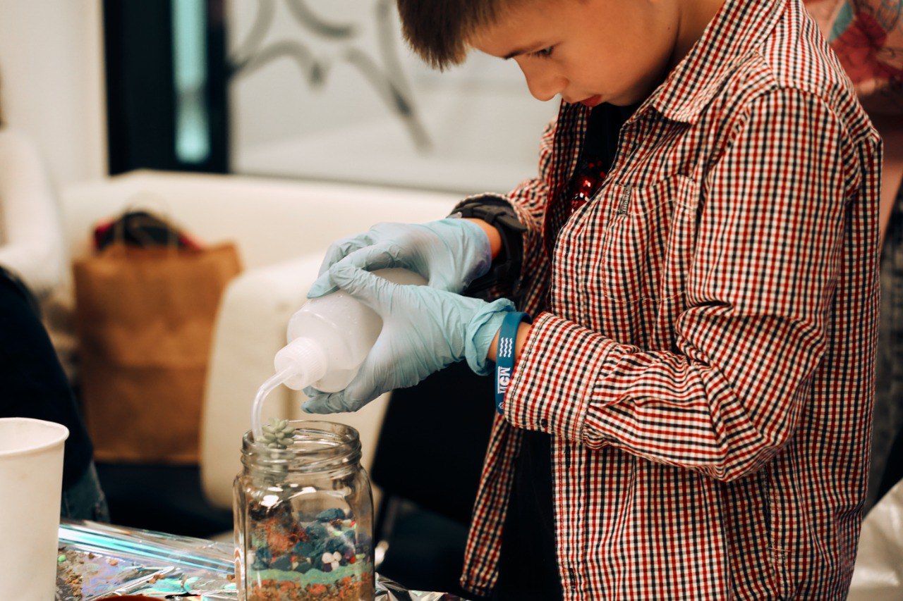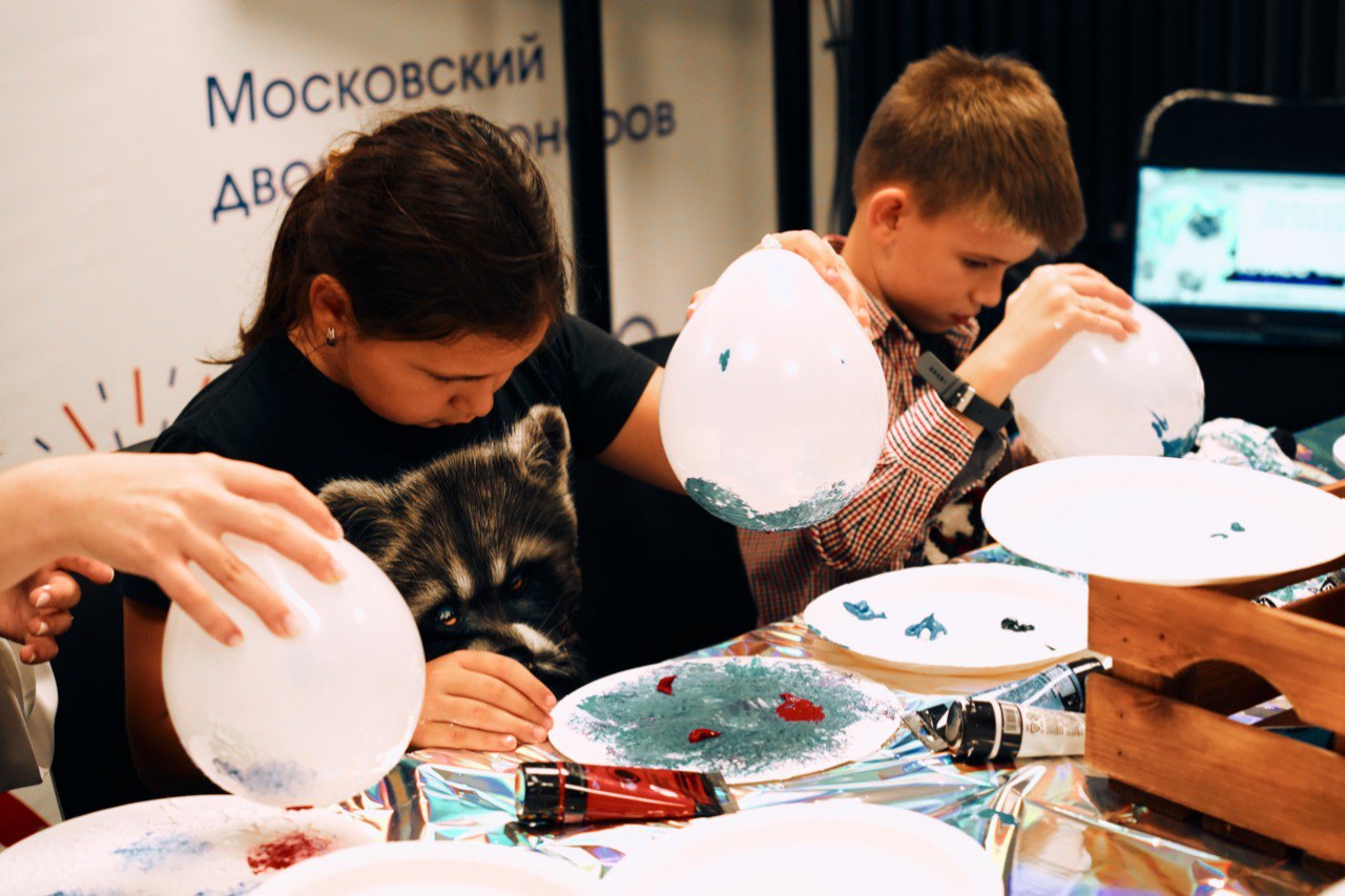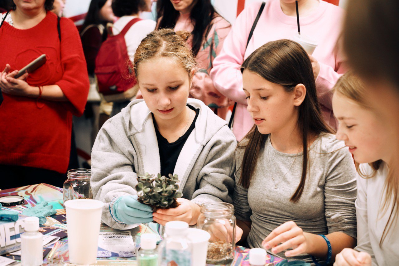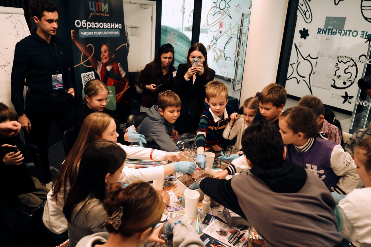 В это же время в интерактивной зоне просветительской площадки РАО кипела творческая и исследовательская работа: под руководством специалистов Центра педагогического мастерства школьники создавали замкнутые экосистемы в банках и рисовали цветы воздушными шарами.