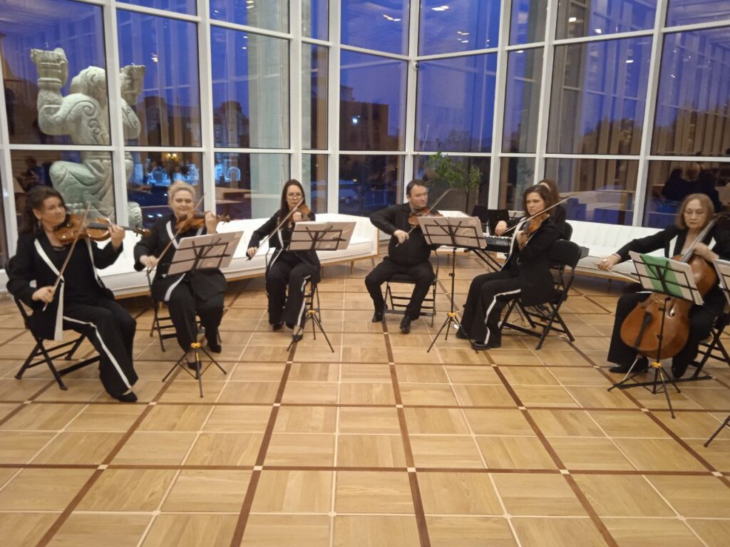 Светский вечер начался благозвучно. На втором этаже играл оркестр. Молодые артисты встречали гостей в фойе. Те, кто служит в театре второй сезон, успели застать время, когда после пожара приходилось играть на чужих сценах.