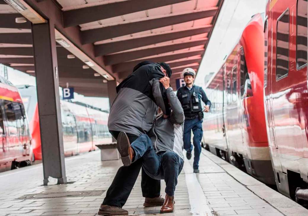 За следующий час становлюсь свидетелем второй за 20 лет моей жизни в Германии реальной драки между взрослыми людьми. Прямо около диспетчерского пункта в центре вокзала сцепилась некая пьяная компания двадцатилетних белых и ещё более пьяный белый немец лет тридцати с грубым выговором. Что-то они похоже у него украли, он напал на одного из молодых. Потом его повалили, били ногами. Потом он встал, снова нападал, его снова роняли. И так минут десять прямо на глазах людей из информационного поста.