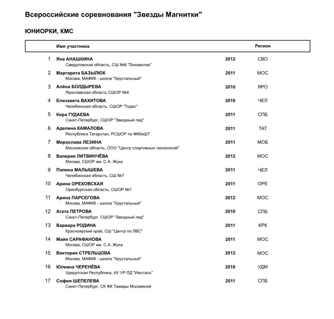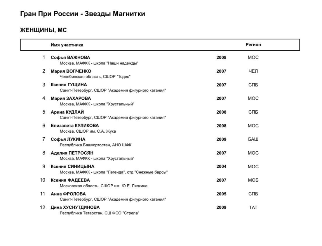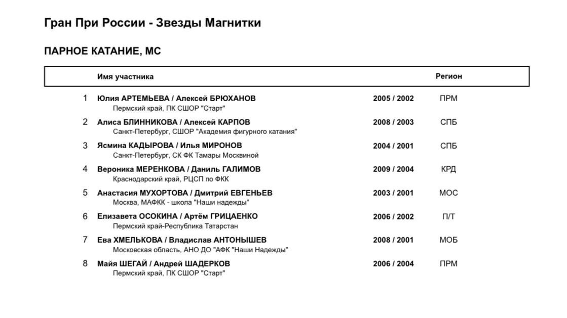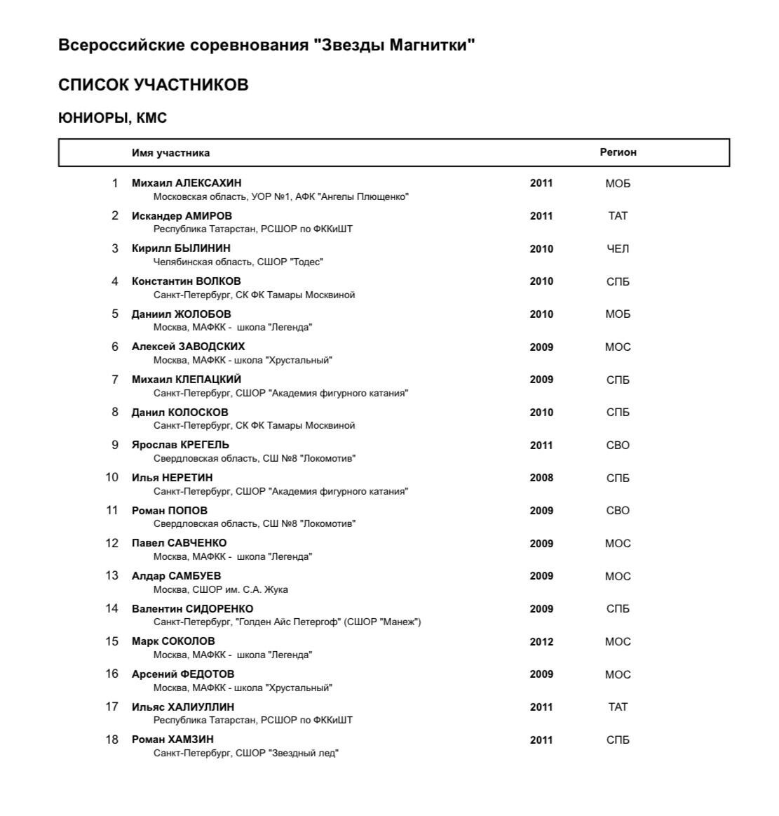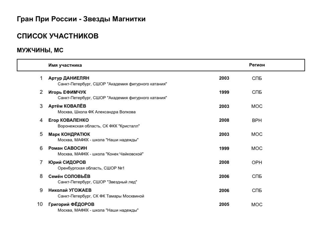 Из других заметных имен в списках есть, в частности, чемпион Европы, участник Олимпиады в Пекине Марк Кондратюк, Роман Савосин, Артур Даниелян, Николай Угожаев, Ксения Гущина, Ксения Синицына, пары Елизавета Осокина / Артем Грицаенко, Анастасия Мухортова / Дмитрий Евгеньев, танцевальные дуэты Софья Леонтьева / Даниил Горелкин, Елизавета Пасечник / Дарио Чиризано.