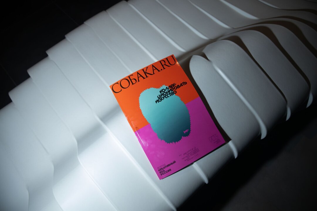 Этот долгоиграющий проект в разных редакциях в виде архитектурного мэппинга побывал на международных выставках, фестивалях (Intervals, «Нур»), закрытых показах. В руках разных авторов инсталляция менялась и вернулась в Петербург практически неузнаваемой на презентацию журнала «Коллекционировать искусство». Вдохновением для цветовых и световых трансформаций инсталляции в этот раз стала его первая обложка: микс DIY-эстетики зинов, конструктивистской типографики и кислотной ультрамодной колористики. Этот визуальный код говорит о бунтарстве, уважении к традиции и о том, что собирать «совриск» — это уже не мимолетный тренд, а способ диалога со временем.