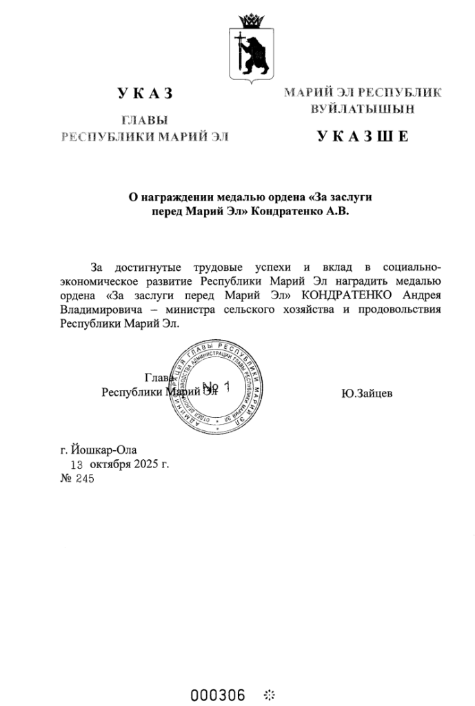 В указе говорится, что медаль ордена «За заслуги перед Марий Эл» министр сельского хозяйства и продовольствия Андрей Кондратенко получил за достигнутые трудовые успехи и вклад в социально-экономическое развитие республики.