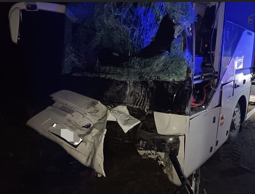 В результате ДТП водитель грузовика погиб на месте. Водитель автобуса получил травму и был доставлен в больницу. О пассажирах в автобусе не сообщается. Отмечается, что погибший водитель грузовика не был пристегнут ремнем безопасности.