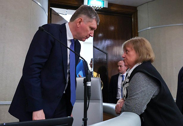 Министр экономического развития РФ Максим Решетников и заместитель Председателя Комитета по обороне Светлана Савицкая