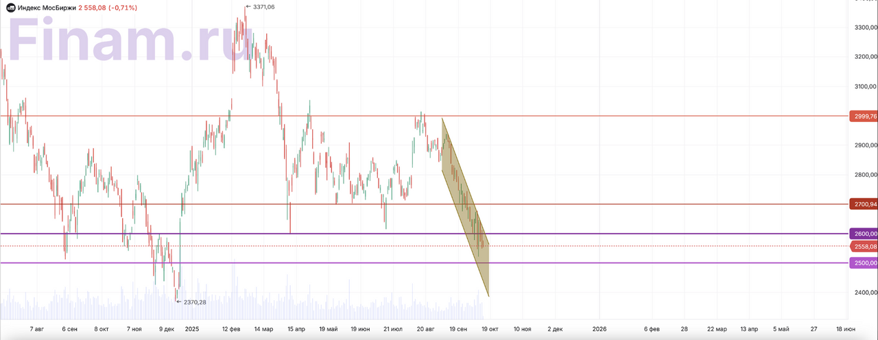 На российском фондовом рынке сохраняется нисходящая динамика: ключевые индексы показывают снижение под давлением сочетания макро- и геополитических факторов. Одним из главных драйверов падения выступает сильное укрепление рубля, которое давит на выручку компаний экспортеров и бюджет РФ. Дополнительное давление создаёт падение мировых цен на нефть, которое связано с возможной торговой войной Китая и США. Также на наш рынок продолжает давить украинский вопрос: возможна эскалация связанная с визитом президента Зеленского в Вашингтон и обсуждением возможных поставок ракет типа Tomahawk, что всё чаще появляется в медиа поле.
