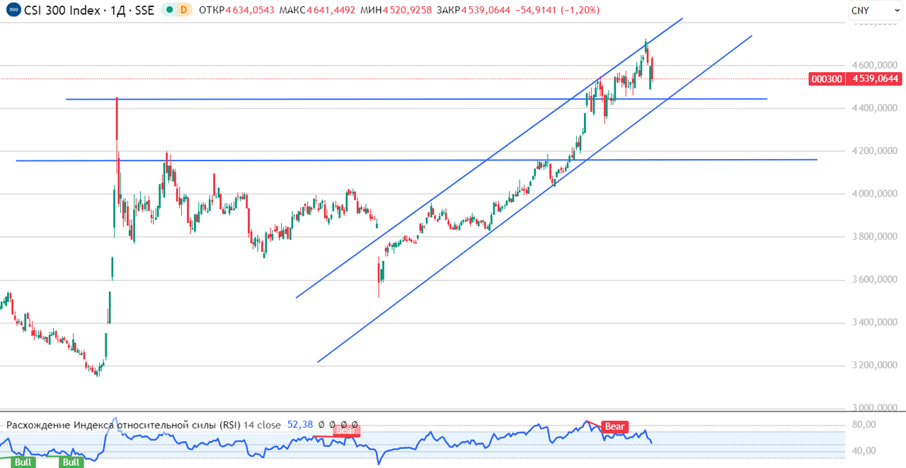 На дневном графике CSI 300 все еще держится в восходящем канале, но ожидается откат до уровня поддержки 4450 пунктов, где уже будет возможность пробить восходящий канал вниз с крупным откатом до 4150 пунктов.