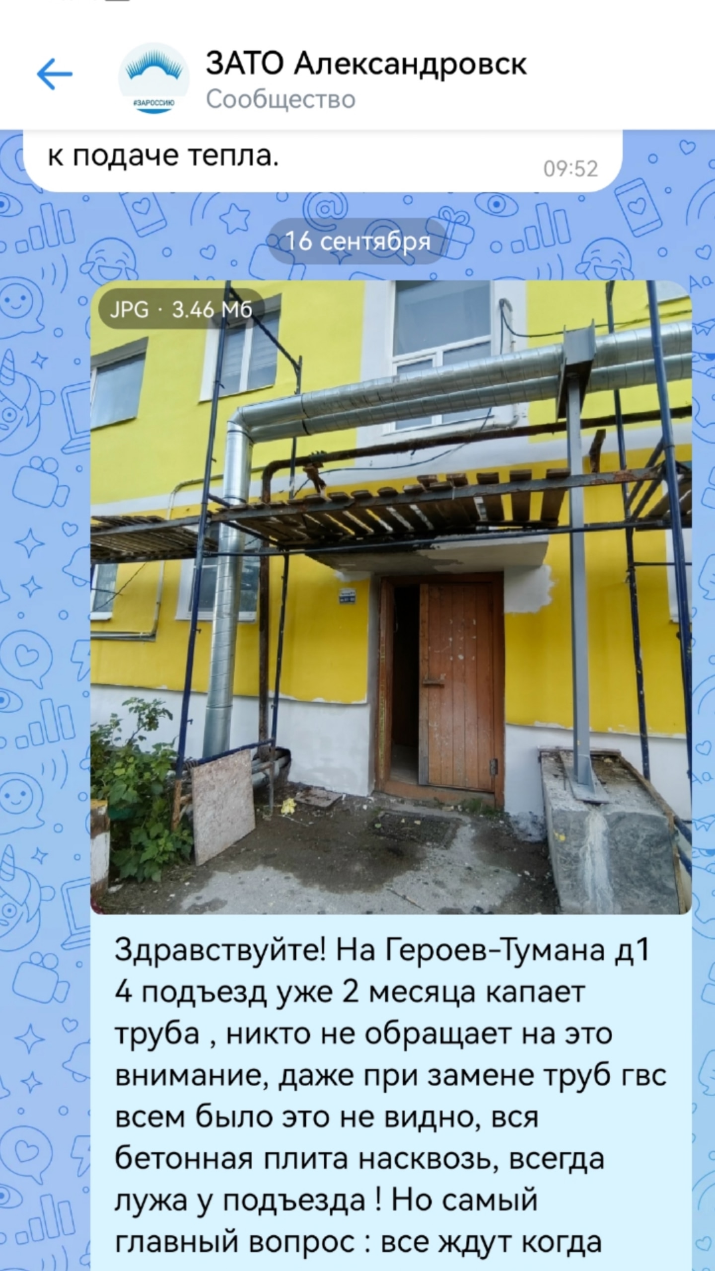 «Я им писала 16 сентября, сказали, займутся в конце октября (если она доживет, так как капает где-то с июня месяца), а это значит, что когда будут заморозки, она просто может не выдержать», — подтвердила комментарии Елена Михалева из Полярного.