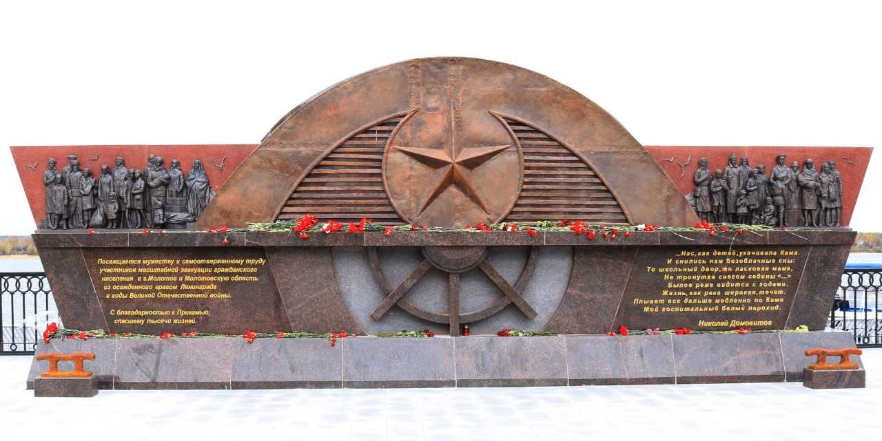 Мемориальная композиция (работа скульптора Алексея Матвеева) появился на центральной набережной Камы. Но это сейчас здесь благоустроенная набережная, а тогда, осенью 1941 здесь, в районе прежних пристаней, где всего менее года как вырос подобающий областному центру Речной вокзал, причаливали первые пароходы из Ленинграда и Москвы, проделавшие изнурительный путь в несколько дней по Волге и Каме. На новом молотовском речном вокзале их пассажиров ждал эвакопункт.