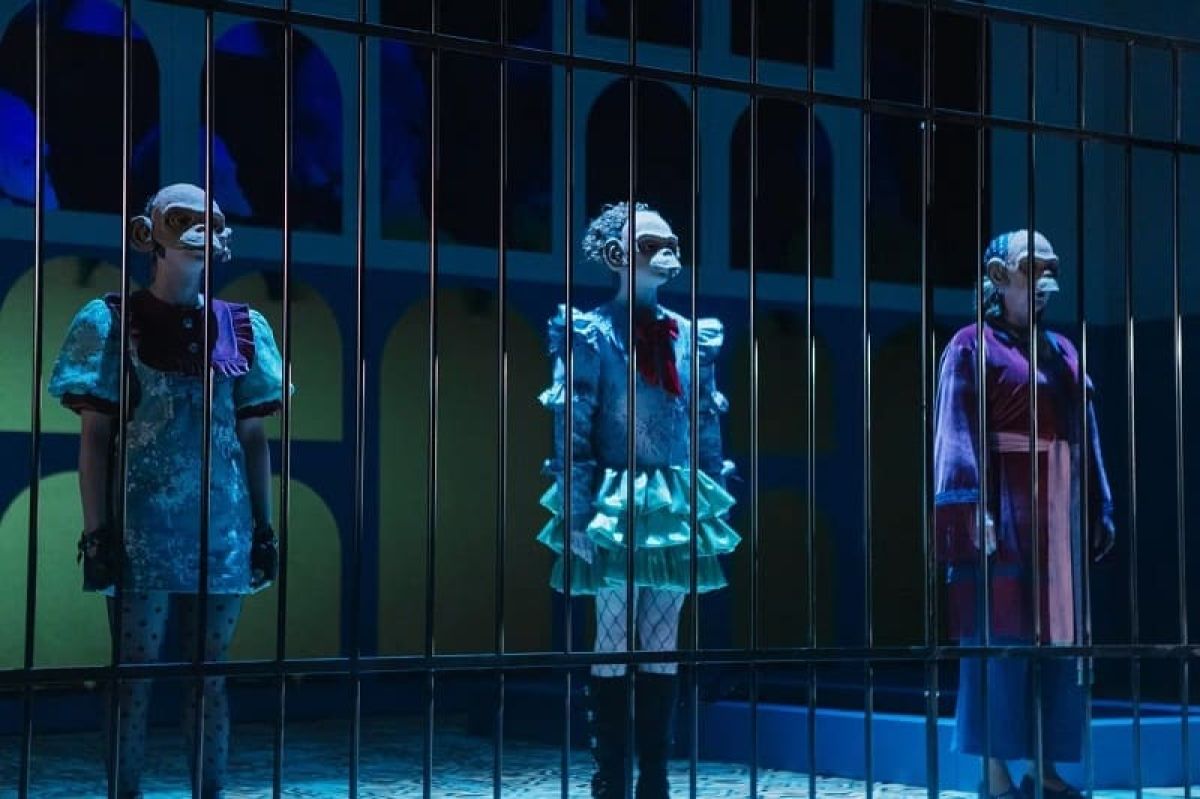 Но настоящий шок для зрителя наступает, когда на сцене появляются остальные персонажи в клоунских костюмах - парад диагнозов начался. Художник спектакля Ульяна Еремина противопоставила Мышкина в строгой тройке (серый цвет явно не случаен) всем прочим ярко одетым: Рогожин в косухе и модных ковбойских ботинках, сестры Епанчины в эксцентрических колготках, Лебедев в офисном мини и гипюровых гольфах, Тоцкий в мехах и шелках, Ганя Иволгин в жабо и кружевах, Настасья Филипповна эффектная, как королева бурлеска, — то чудовища, которые погубят князя. Апофеоз зверства — начало второго акта, который открывают сестры Епанчины в масках: единственный человек (Мышкин) прибыл на планету обезьян. Или в сумасшедший дом? Декорация настаивает на последнем: больничный кафель огорожен высокими стенами в характерном двуколоре (вверху побелка, внизу синий монохром).