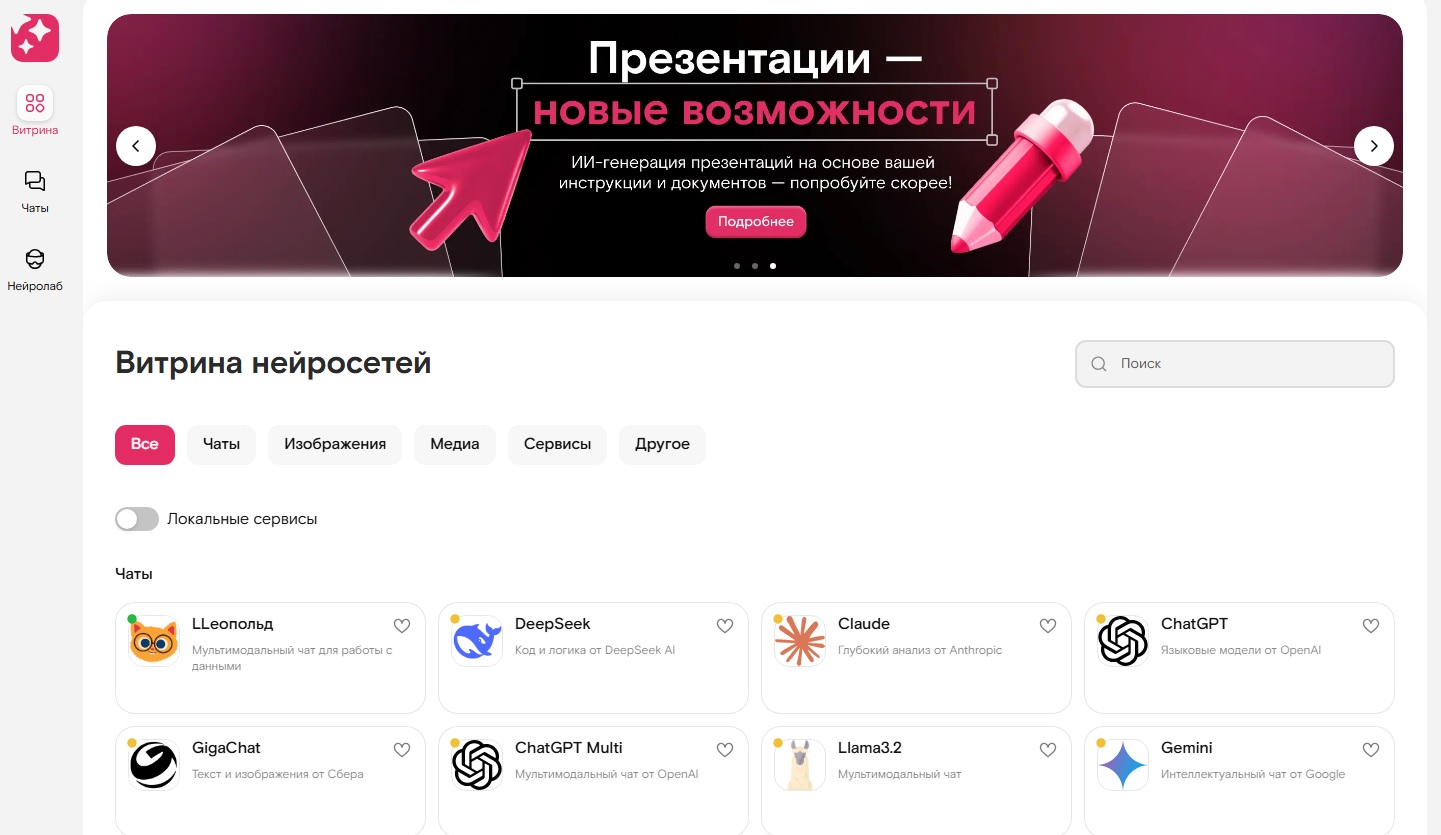 На портале представлено 27 ИИ-инструментов, ориентированных на достижение разнообразных целей: DeepSeek, GigaChat, ChatGPT, Gemini, Yandex Art и другие. Сервис способен ежемесячно обрабатывать около 470 тысяч запросов и сокращать до 40 % времени персонала на выполнение рутинных операций.