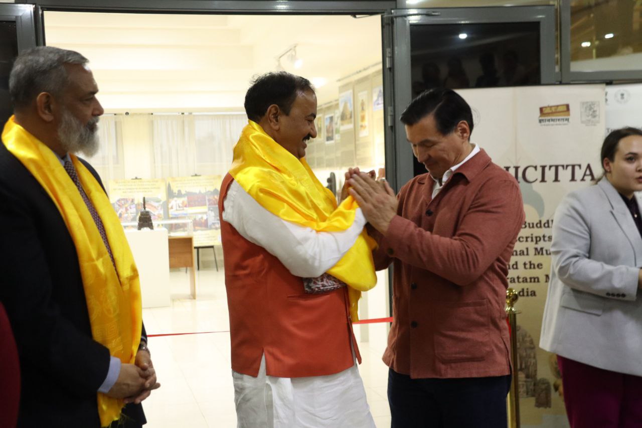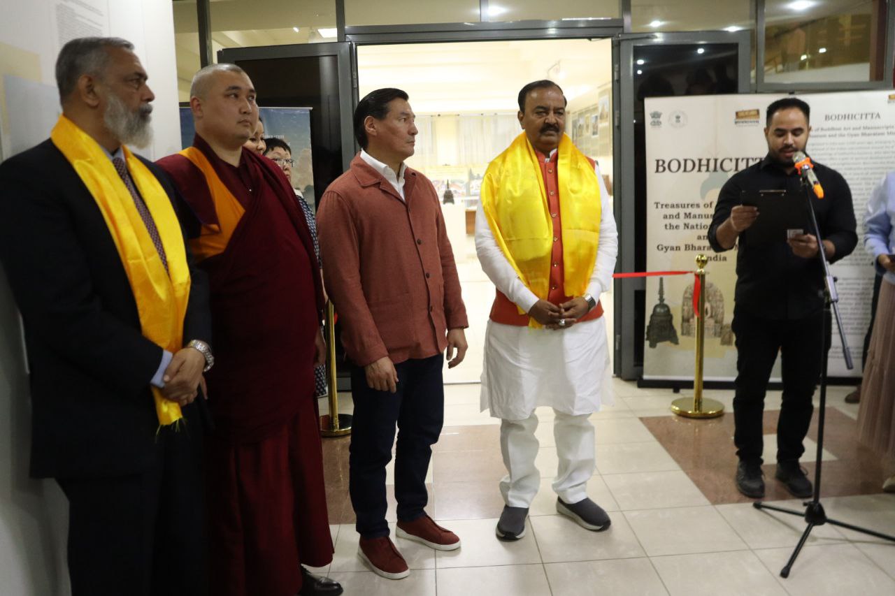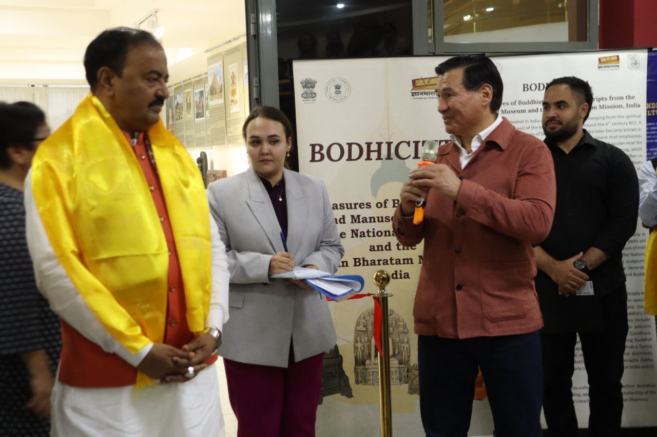 Сегодня здесь не одна выставка. Это выставка, подготовленная Международной буддийской конфедерацией, Национальным музеем Индии, выставка Национальной миссии по манускриптам, выставка известного индийского художника. За эту насыщенную программу выражаю благодарность Национальному центру искусства имени Индиры Ганди, посольству Индии в России, культурному центру при посольстве и еще многим-многим людям и организациям», – поблагодарил от лица всех калмыцких монахов председатель Центрального духовного управления буддистов России геше Йонтен.