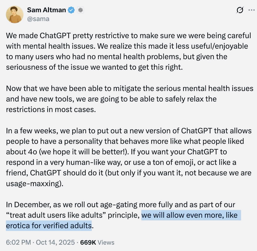 Кроме того, в декабре OpenAI внедрит систему проверки возраста и в рамках принципа «относиться к взрослым как к взрослым» разрешит больше контента для совершеннолетних пользователей, включая эротические материалы, но только для подтвержденного возраста.