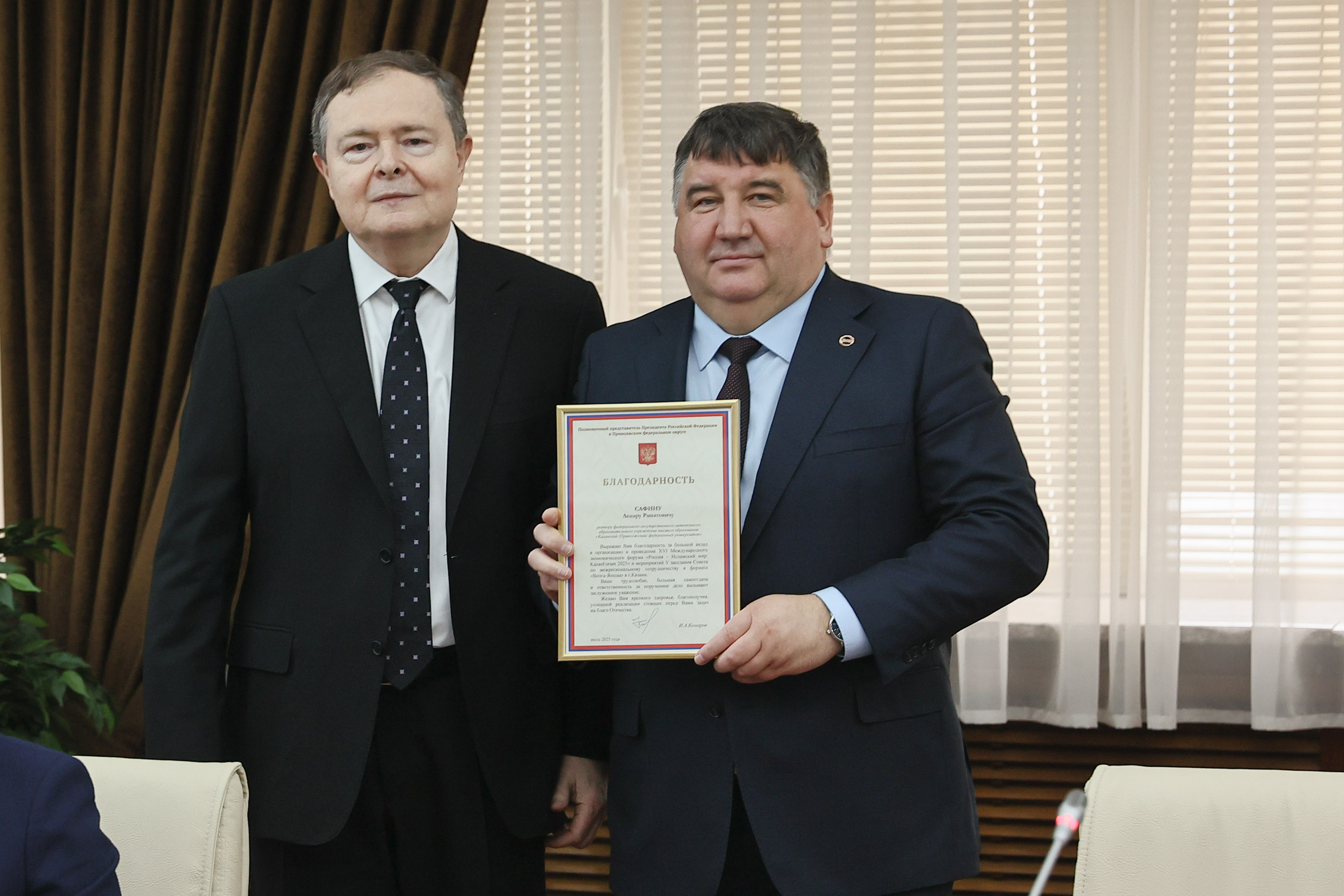 Перед началом обсуждения Виктор Демидов торжественно вручил руководителю КФУ благодарность Полномочного представителя Президента Российской Федерации в Приволжском федеральном округе ИгоряКомарова.