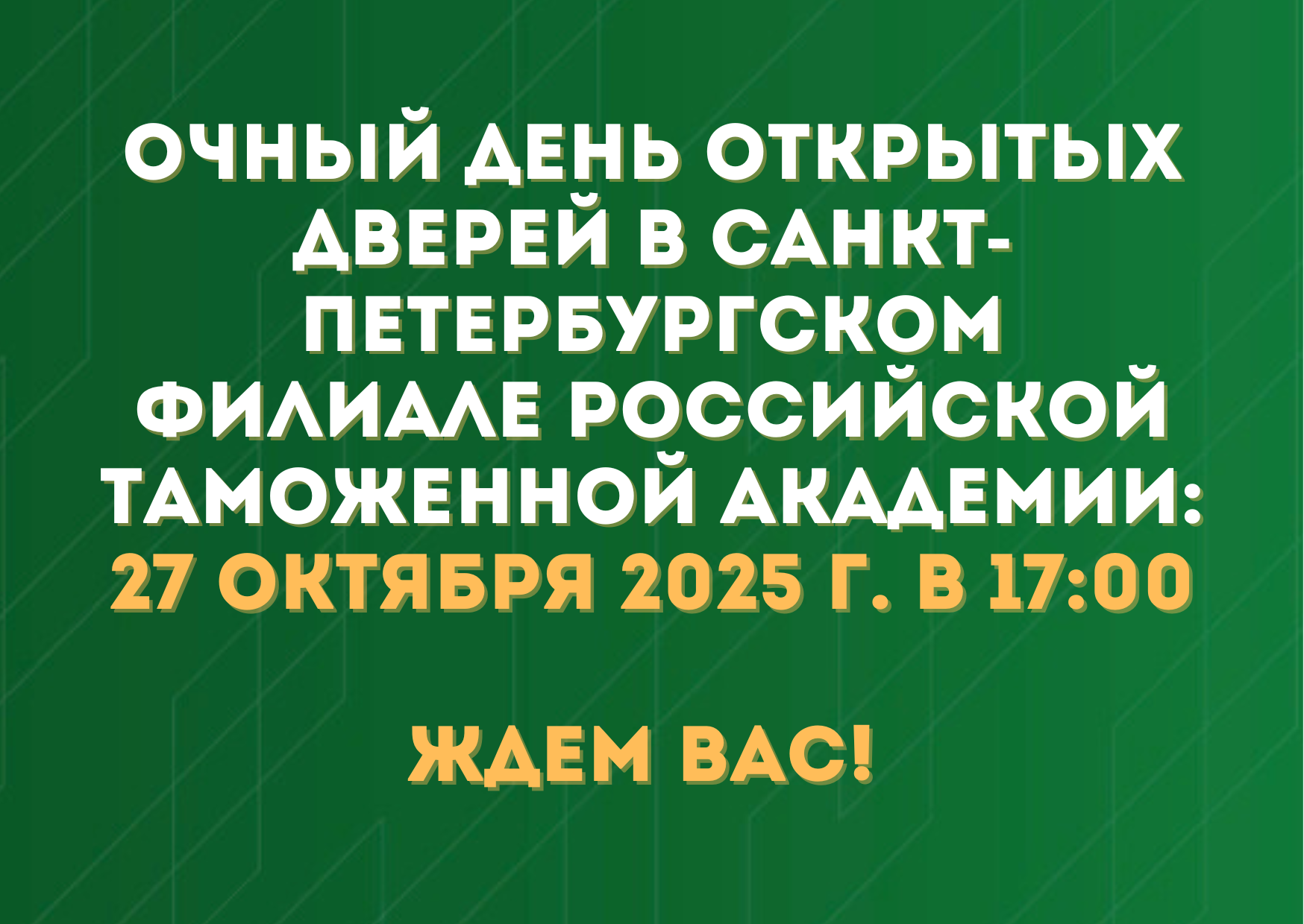 27 октября 2025 года в 17:00в Санкт-Петербургском филиале Российской таможенной академии состоится День открытых дверей в очном формате, на котором Вы сможете поближе познакомиться с теми направлениями подготовки (специальностью), которые реализованы в филиале, а также пообщаться с представителями факультетов и профессорско-преподавательским составом.