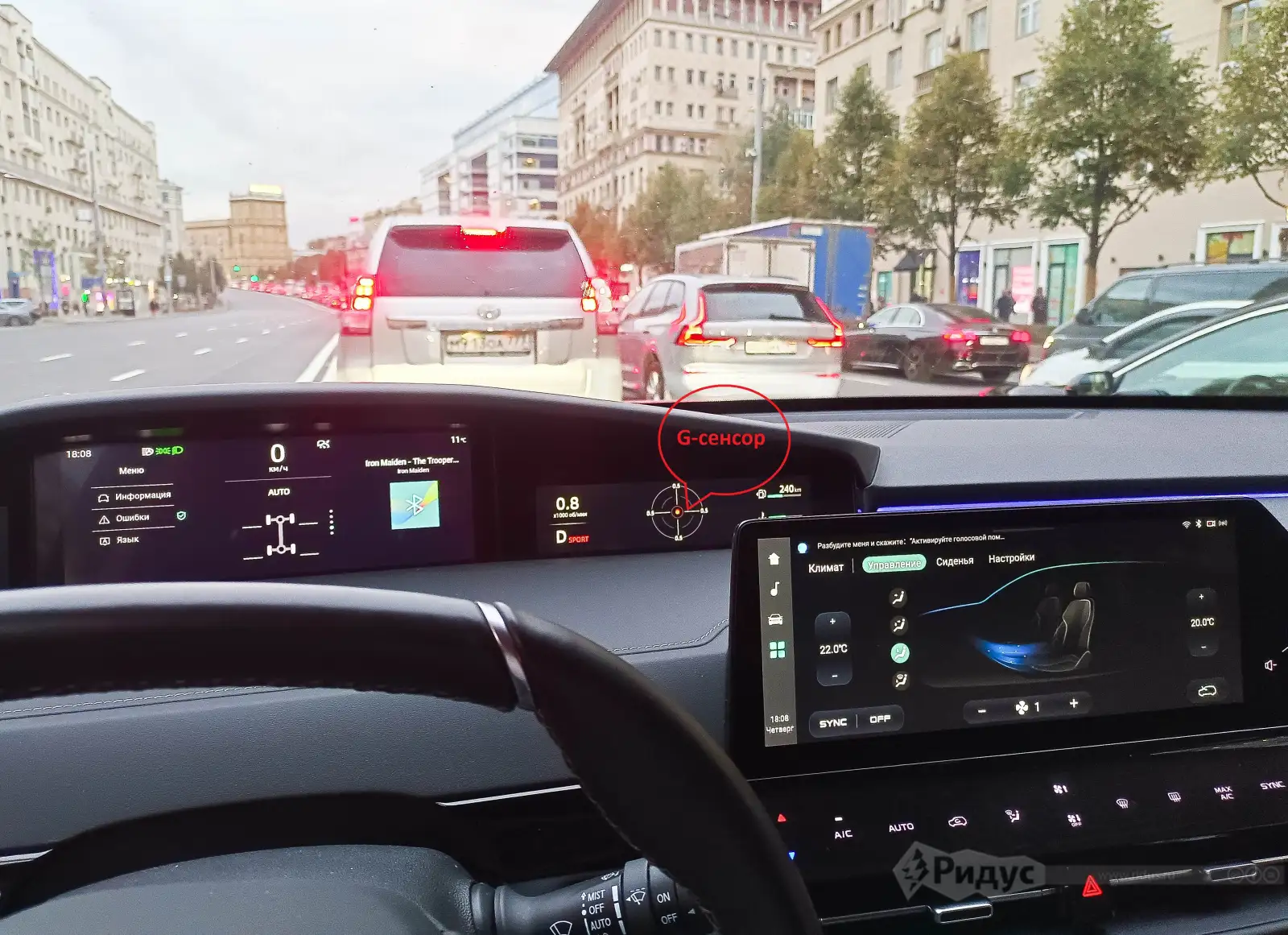 Ещё одним забавным девайсом является G-сенсор с правого края той же панели, включающийся при переводе машины в спортивный режим. Назначение устройства вряд ли известно 99% автомобилистов (не будем расписывать его в рамках этого обзора), зато смотрится оно довольно красиво.