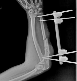 Вначале доктора хирургически обработали рану раны с пластикой местными тканями и установили аппарат КСВП (для быстрой чрезкостной фиксации переломов трубчатых костей) на локтевую кость предплечья.