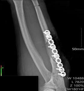 Спустя три недели медики сделали открытую репозицию (процедуру, направленную на сопоставление фрагментов кости после перелома), и погружной остеосинтез локтевой кости пластиной и винтами – фиксирующие элементы установили в область перелома.