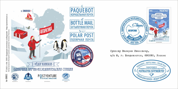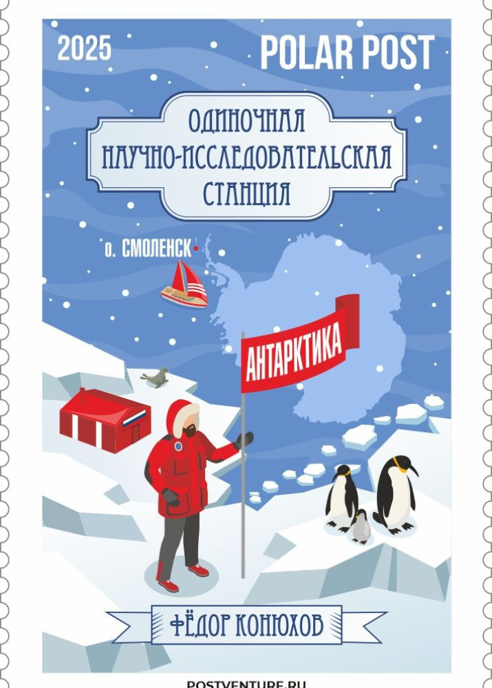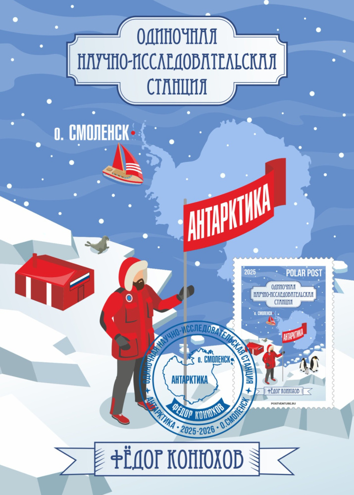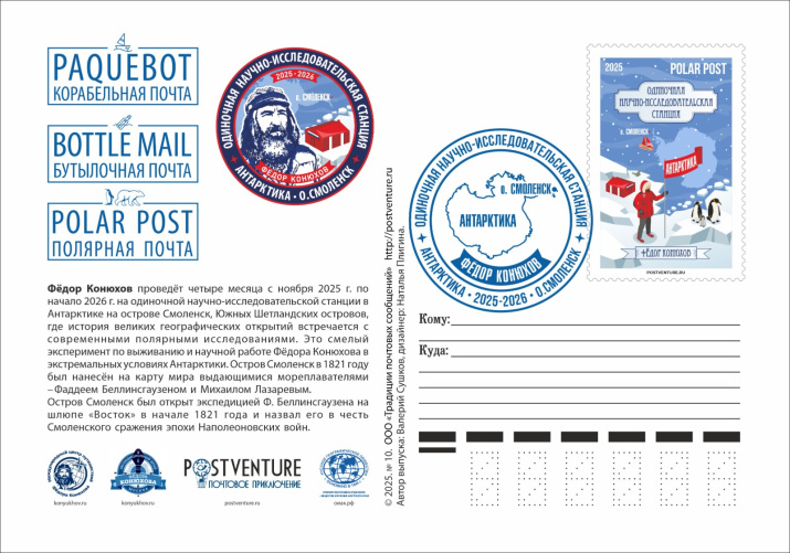 Экспедиционный штаб Федора Конюхова, Международный центр путешествий Федора Конюхова и Всероссийский проект развития филатуризма «POSTVENTURE & Почтовое приключение» при поддержке Приморского краевого отделения Русского географического общества - Общества изучения Амурского края, Министерства Морской & Бутылочной Почты (ООО «Традиции почтовых сообщений») и Международного морского клуба «Мореплаватель» ограниченным тиражом выпустили в свет почтовый выпуск «Одиночная антарктическая станция на острове Смоленск экспедиции Фёдора Конюхова».