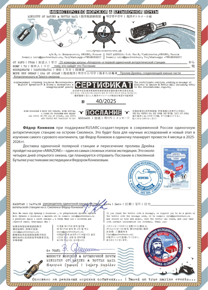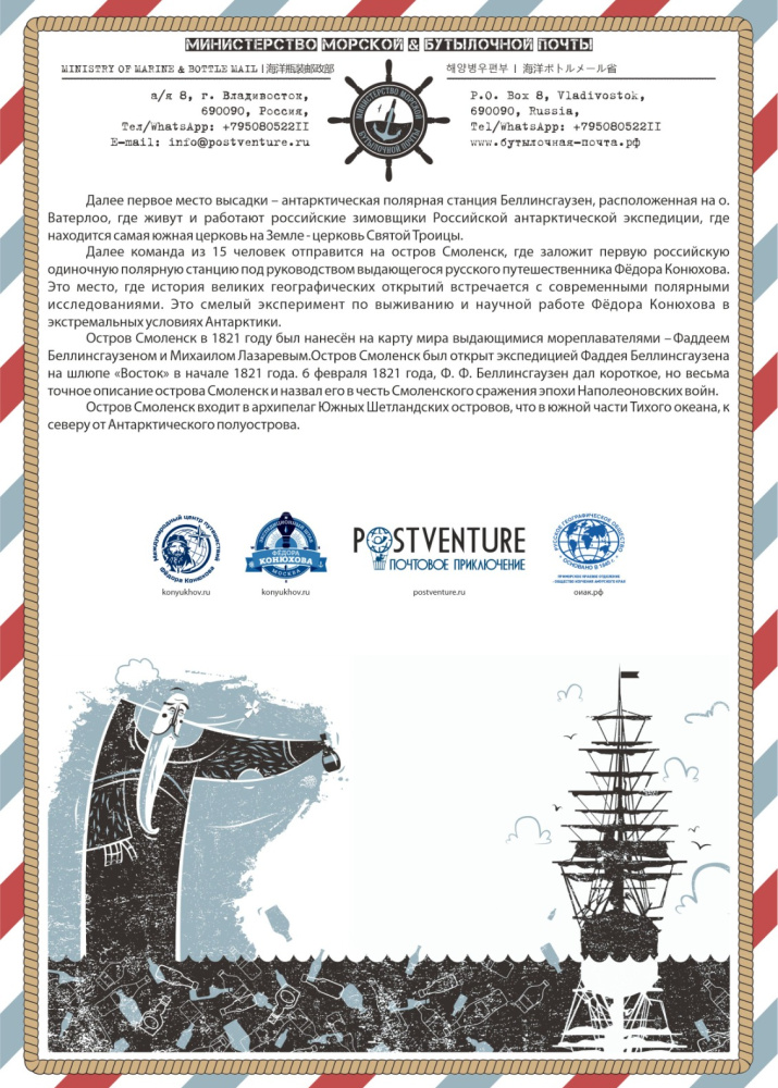 Почтовый набор «Одиночная антарктическая станция на острове Смоленск экспедиции Фёдора Конюхова», представленного «Корабельной почтой», «Бутылочной почтой» и «Полярной почтой», можно заказать по контактам Всероссийского проекта развития филатуризма «POSTVENTURE & Почтовое приключение»: E-mail: info