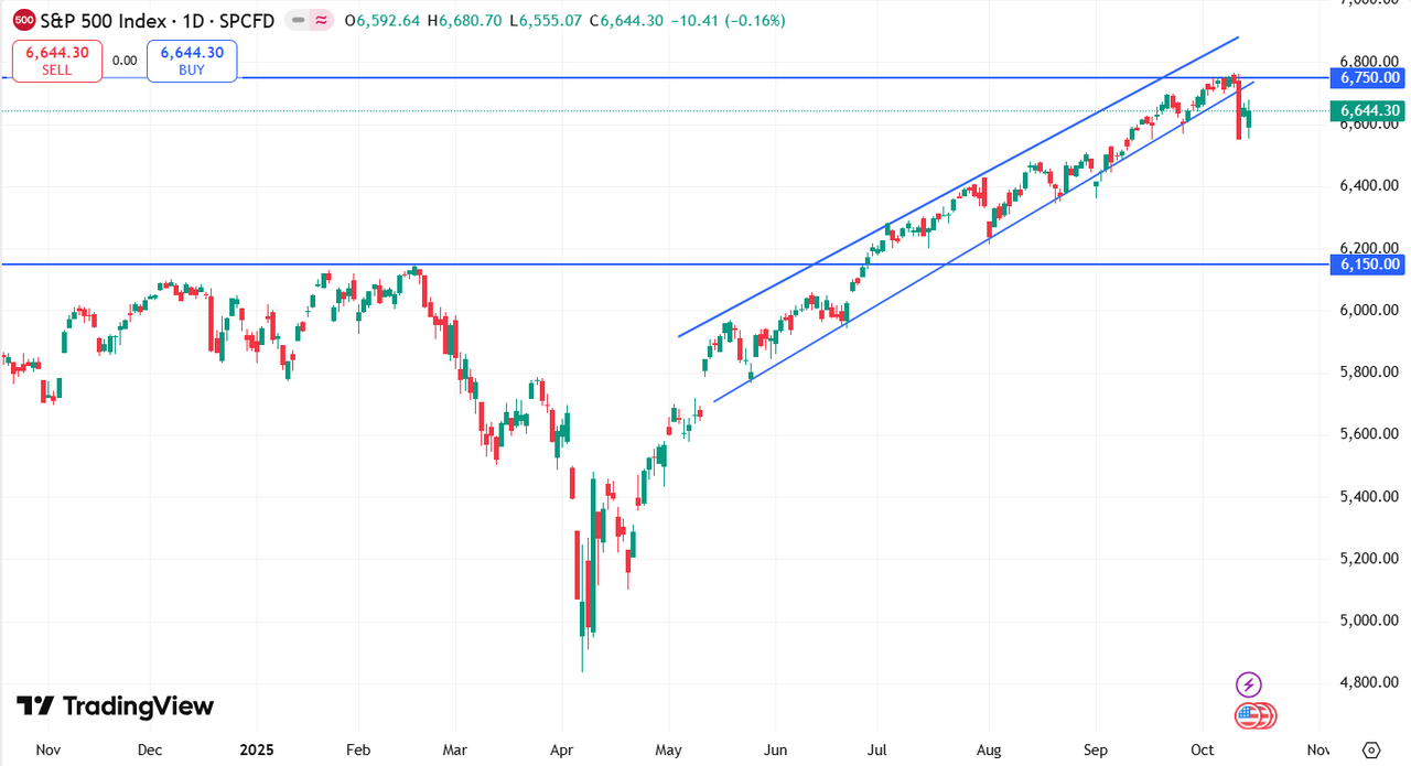 Индекс S&P 500 торгуется на уровне 6 644,3 пунктов. Ранее был небольшой отскок, который не вернул индекс в траекторию восходящего тренда. В случае, пробоя сопротивления выше 6 750 пунктов рынок может вернуться к восходящему движению и обновить максимум