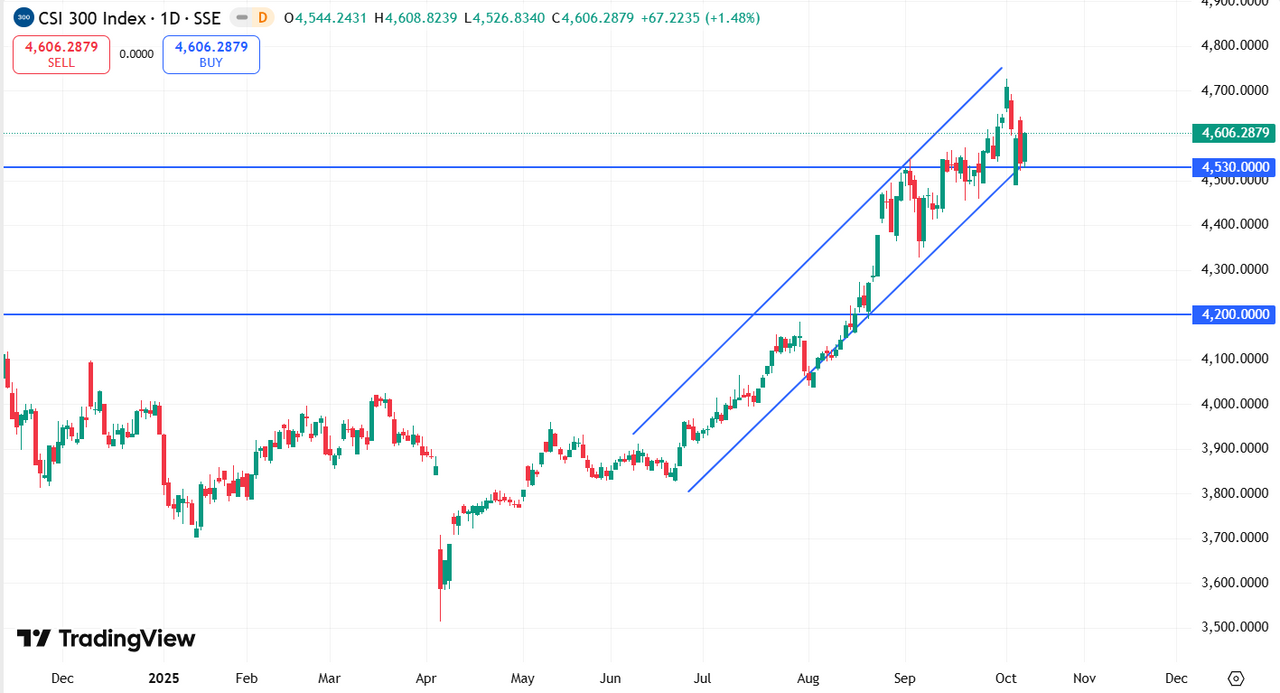 Индекс CSI 300 остаётся в восходящем тренде, удерживаясь выше уровня 4 530 пунктов. Сохранение этого уровня откроет путь к росту в район 4 700 пунктов, а пробой вниз может привести к снижению к 4 200 пунктов.