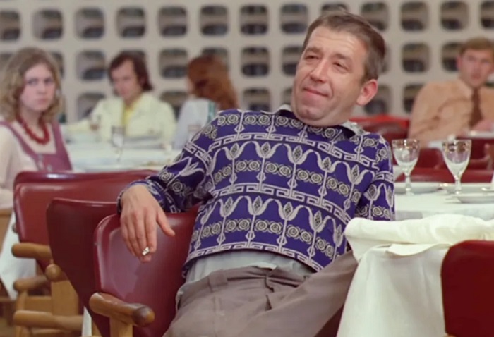 Брондуков в этом свитере действительно производил впечатление вконец опустившегося пьяницы. Его даже не хотел пропускать в ресторан швейцар, а ведь именно там надо было снимать сцену, как опечаленный Афоня в компании друга Федула прогуливает гонорар за краденую мойку.