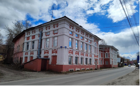 Первый лот — "Дом купца Башкирова" в Городце. Построенное в 1907 году здание площадью более 2 тысячи кв. метров ранее использовалось как Дом культуры судоверфи. Сейчас оно признано нежилым и находится в неудовлетворительном состоянии. Вместе с ним на торги выставлен земельный участок площадью 1809 кв. метров, предназначенный под здание развлекательного центра.