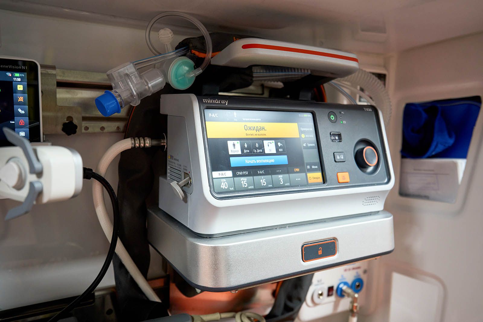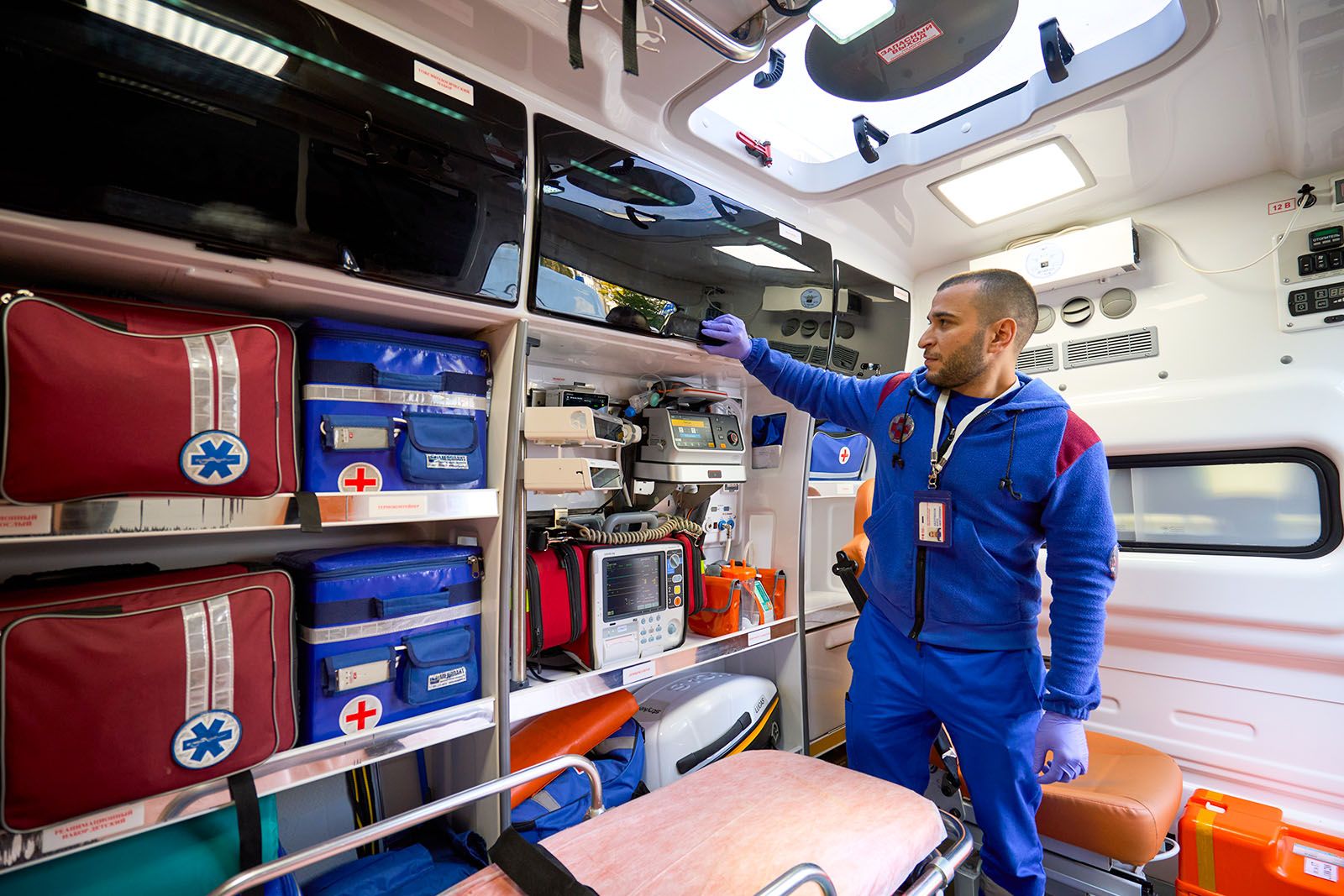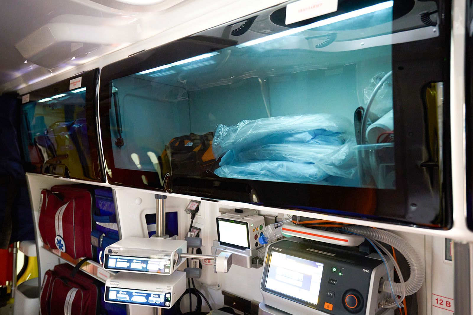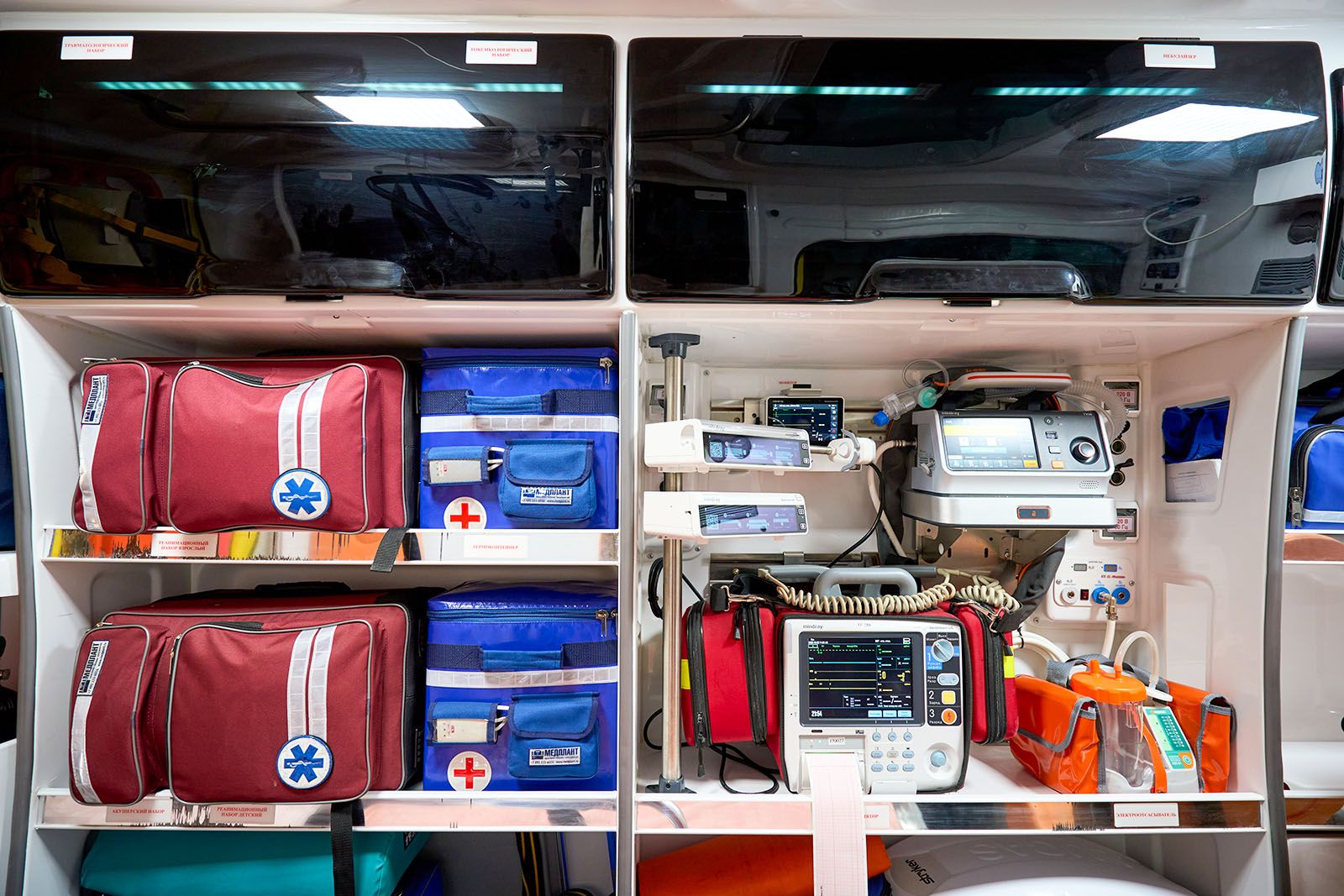 Еще в машине установлены аппарат искусственной вентиляции легких с турбиной, благодаря которой можно не использовать тяжелый и громоздкий кислородный баллон, электрокардиограф, дефибриллятор для запуска сердца электрическим разрядом (он же позволяет в режиме реального времени транслировать данные о показателях пациента в центр критических состояний, где ведущие специалисты подключаются и консультируют бригаду) и аппарат автоматических компрессий в пластиковом кофре.