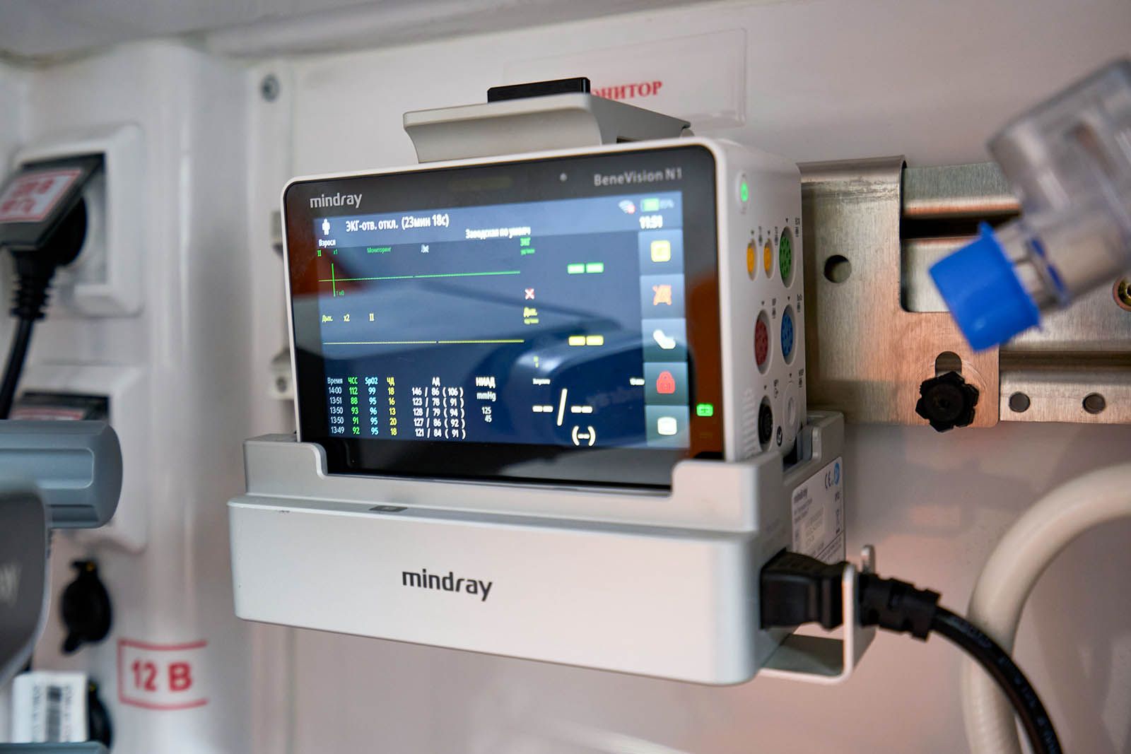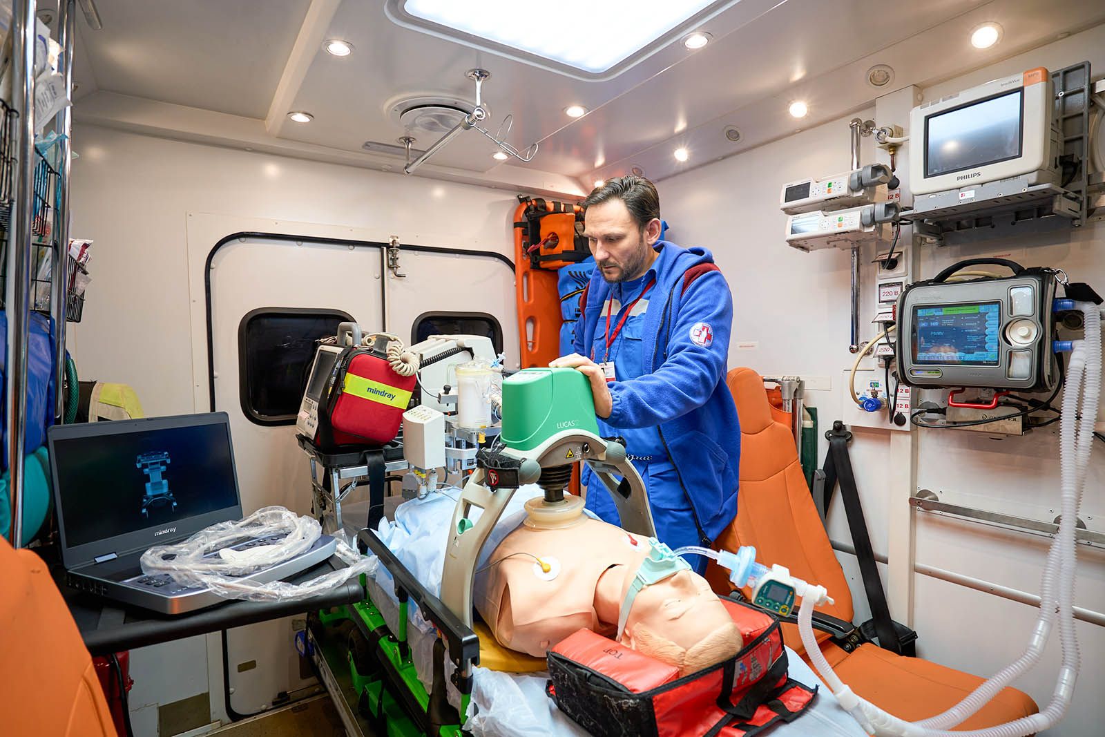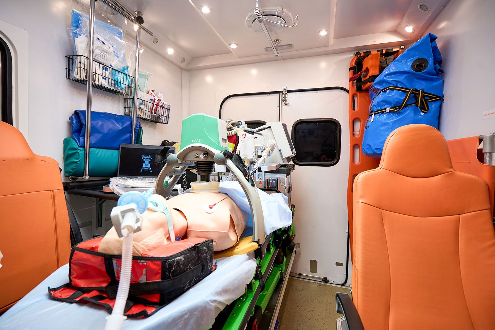 Еще в машине установлены аппарат искусственной вентиляции легких с турбиной, благодаря которой можно не использовать тяжелый и громоздкий кислородный баллон, электрокардиограф, дефибриллятор для запуска сердца электрическим разрядом (он же позволяет в режиме реального времени транслировать данные о показателях пациента в центр критических состояний, где ведущие специалисты подключаются и консультируют бригаду) и аппарат автоматических компрессий в пластиковом кофре.