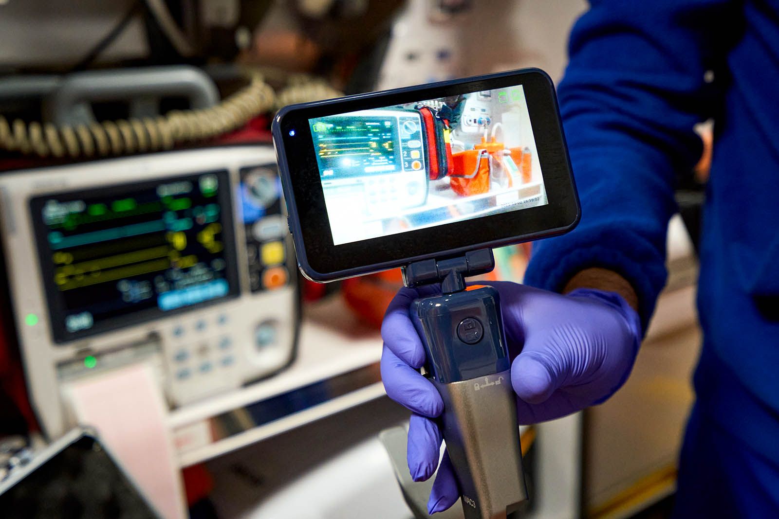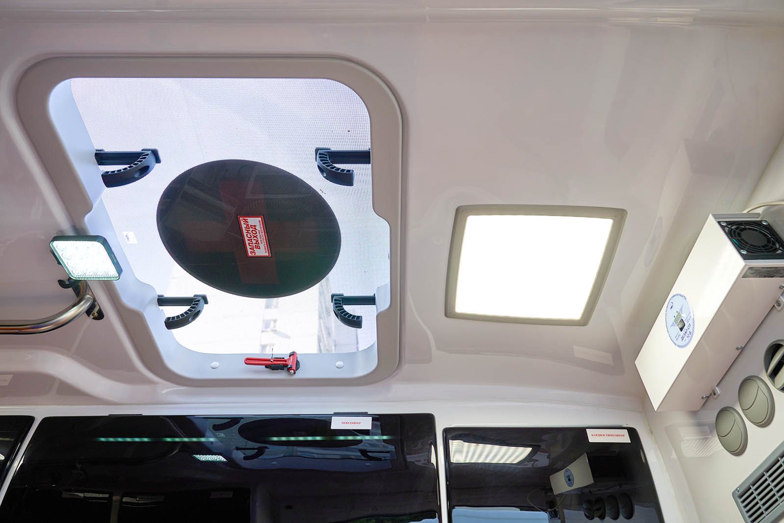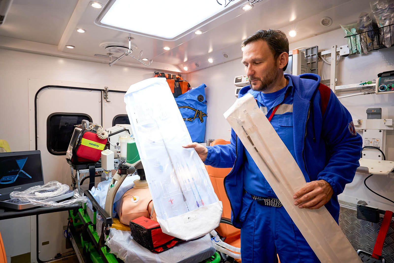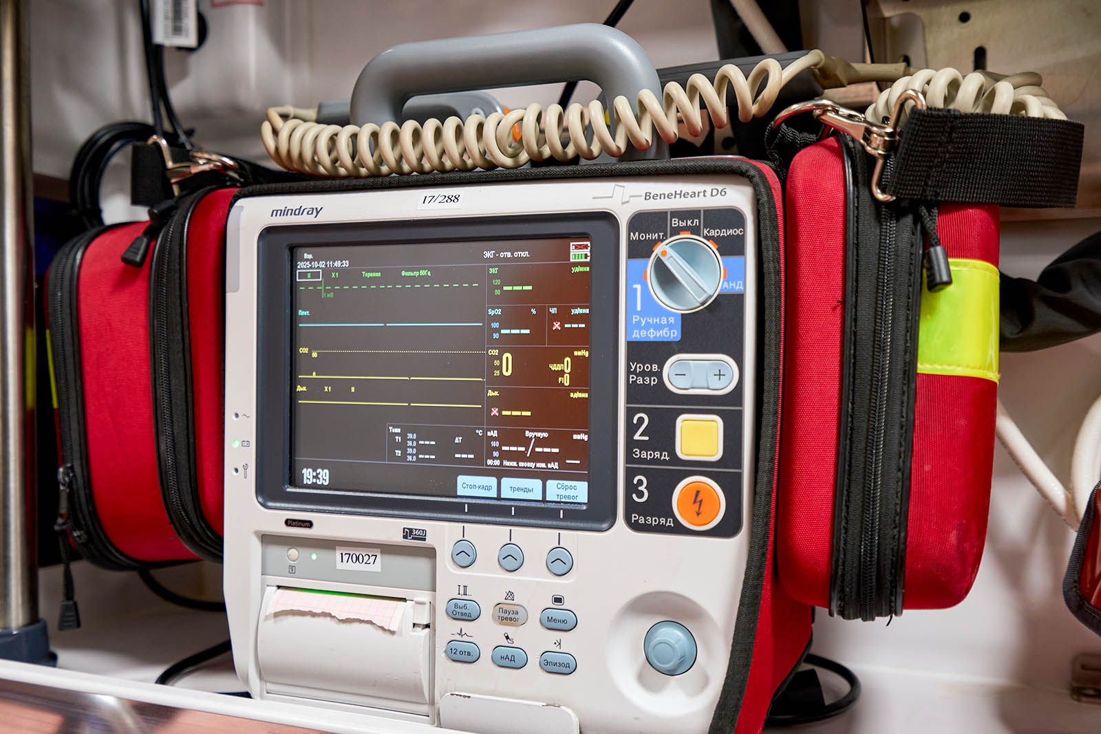 Еще в машине установлены аппарат искусственной вентиляции легких с турбиной, благодаря которой можно не использовать тяжелый и громоздкий кислородный баллон, электрокардиограф, дефибриллятор для запуска сердца электрическим разрядом (он же позволяет в режиме реального времени транслировать данные о показателях пациента в центр критических состояний, где ведущие специалисты подключаются и консультируют бригаду) и аппарат автоматических компрессий в пластиковом кофре.