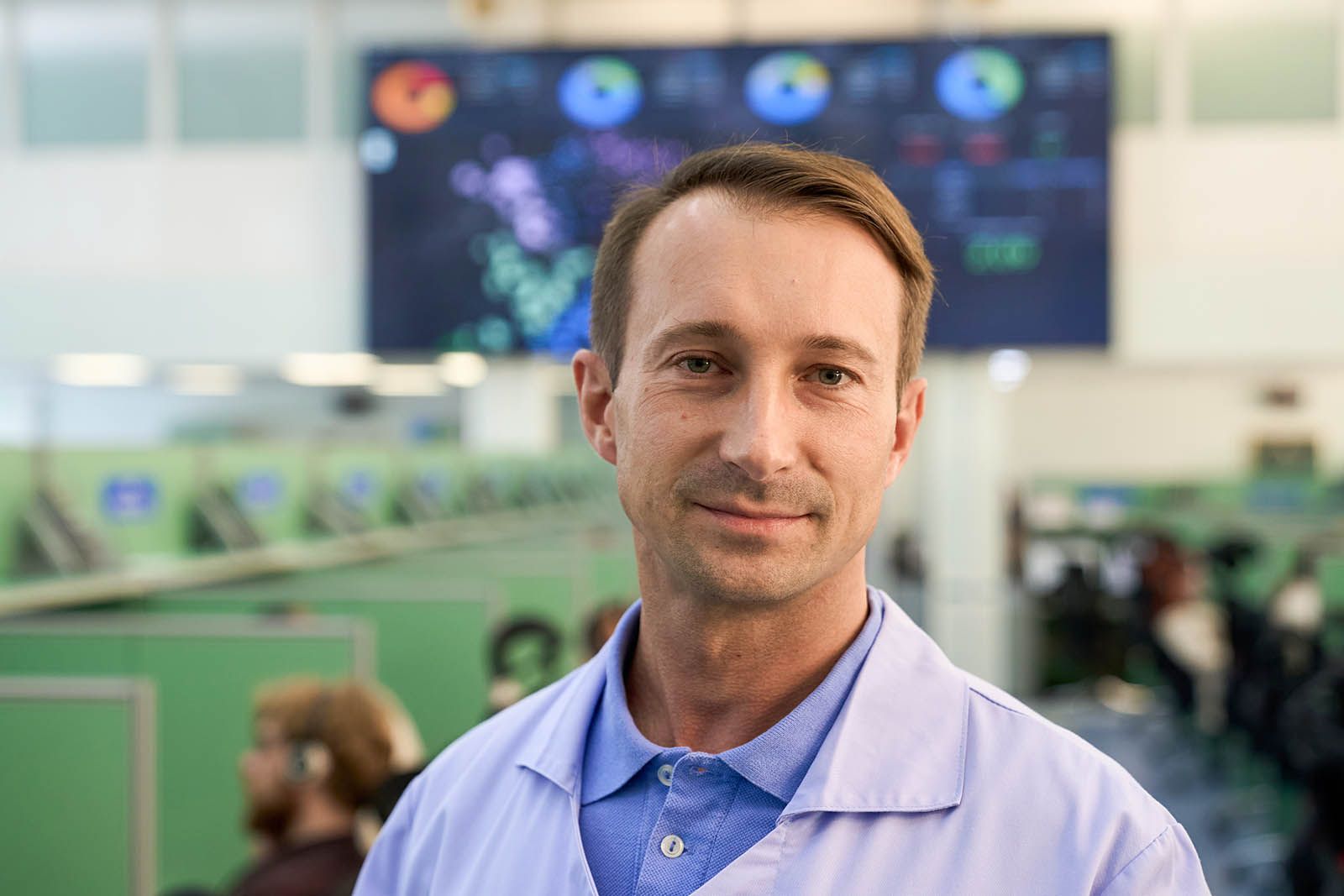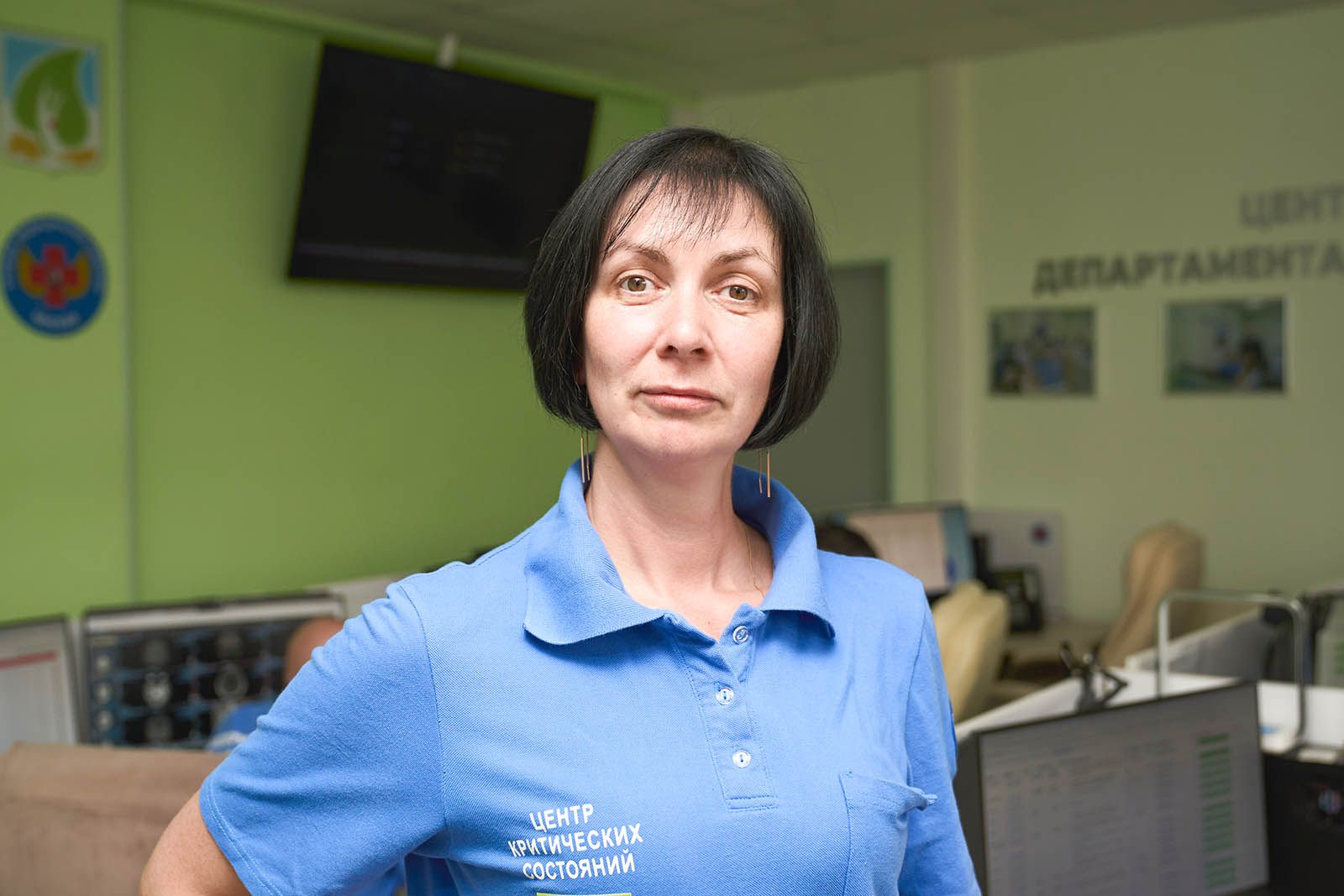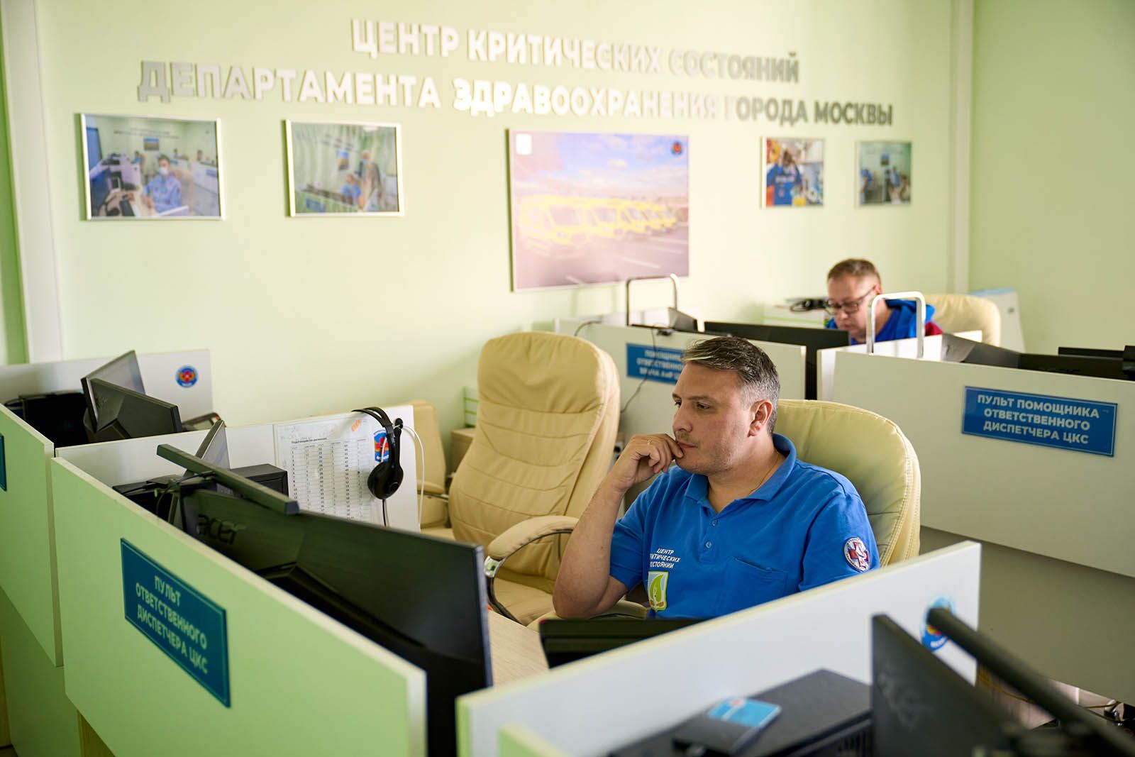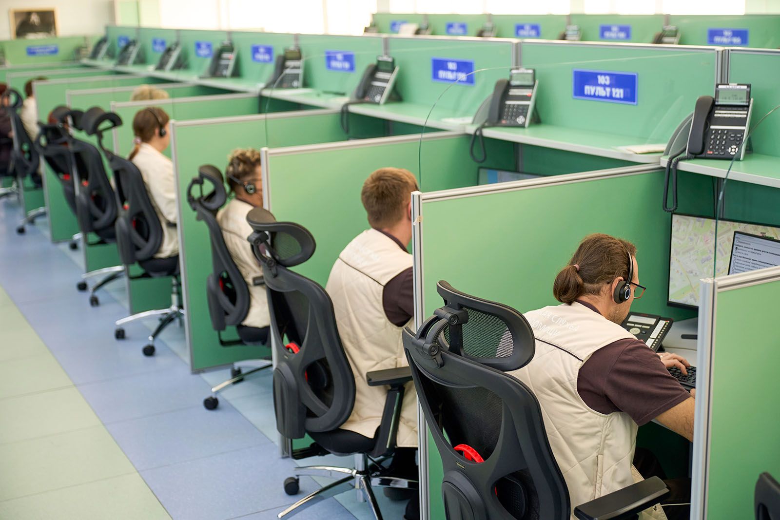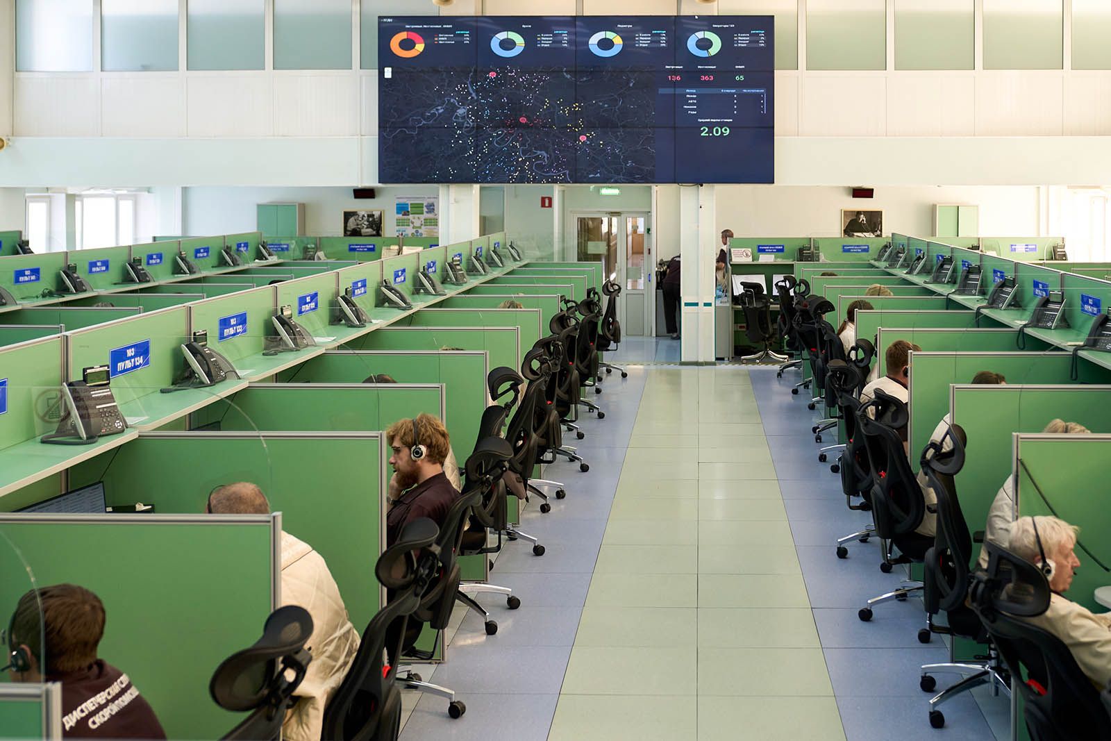 «У нас в штате 65 диспетчеров. Разноцветные диаграммы на табло показывают, сколько процентов из них сейчас в режиме ожидания, сколько принимают обращения, сколько врачей задействовано на экстренных вызовах, сколько на обычных. Сейчас день, преобладает синий цвет, это значит, что большинство операторов ждут звонка. Обычно пиковые часы — утренние и вечерние. В день поступает около 15 тысяч обращений», — говорит старший врач оперативного отдела Андрей Ольшевский.