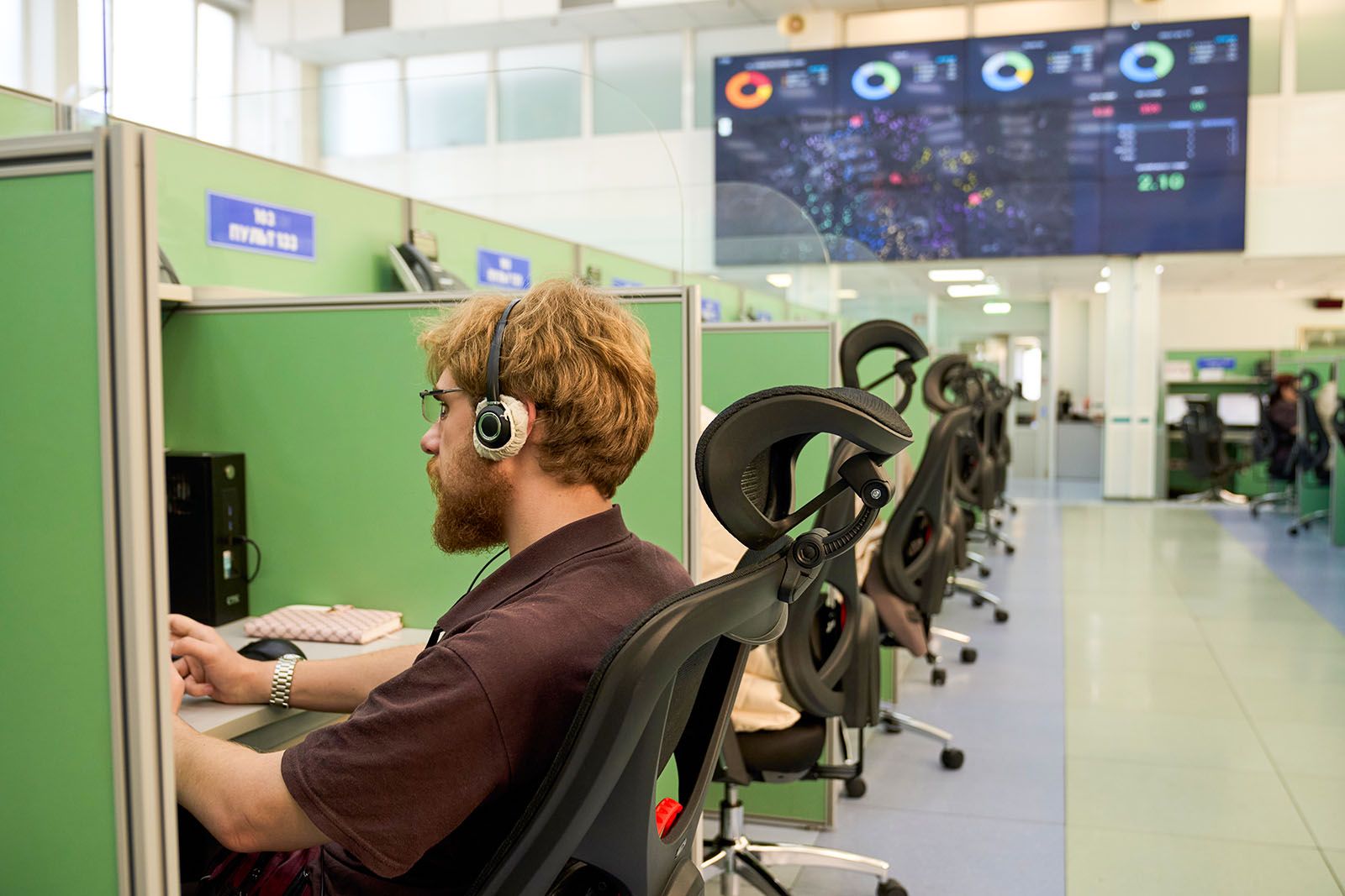 На стене центра — табло с информацией о занятости персонала.