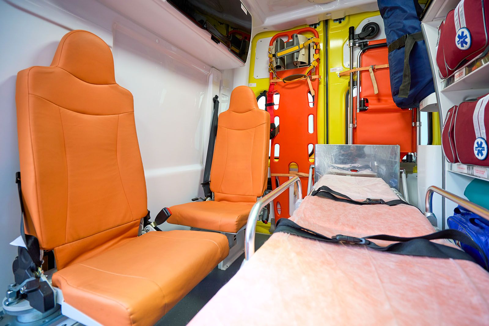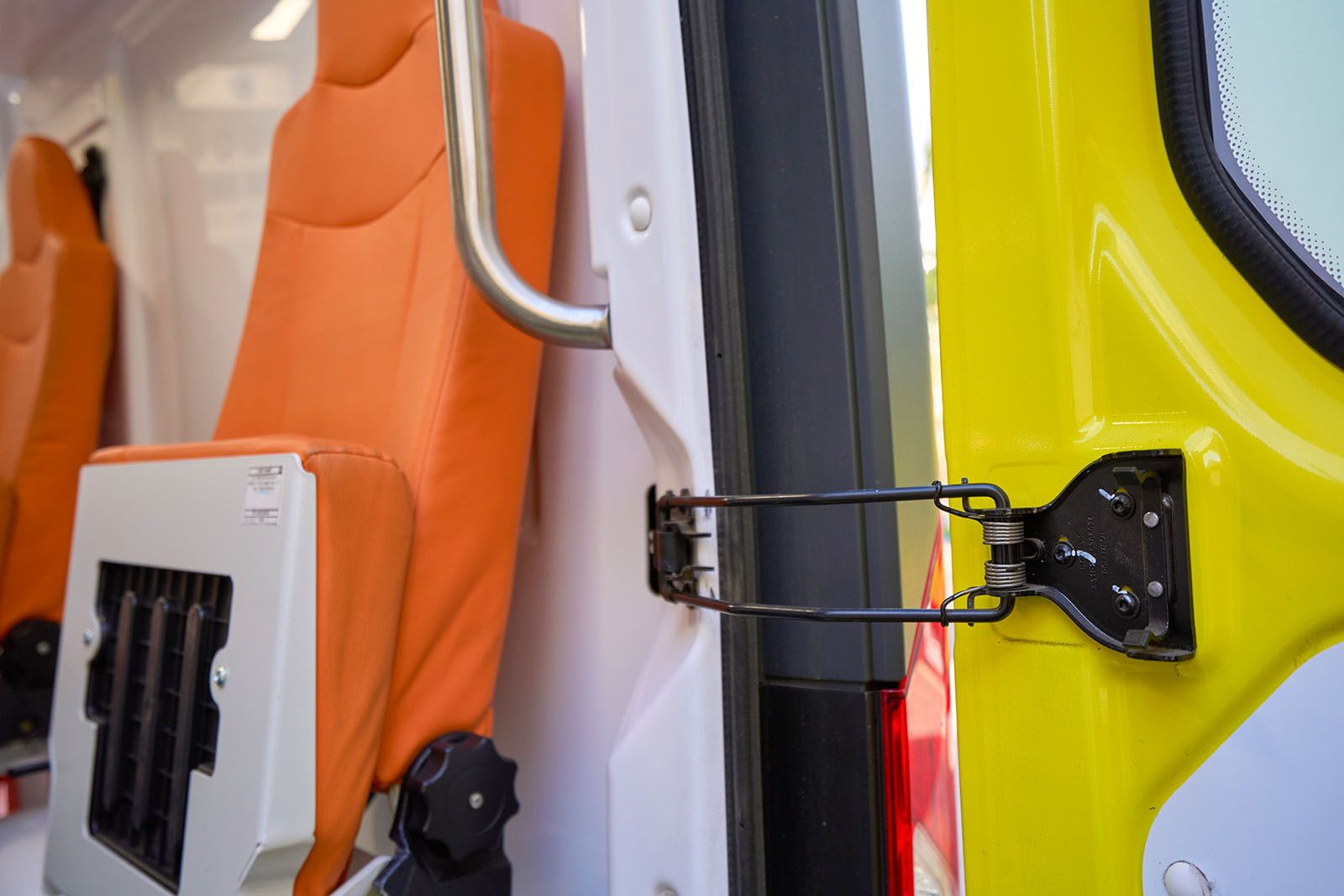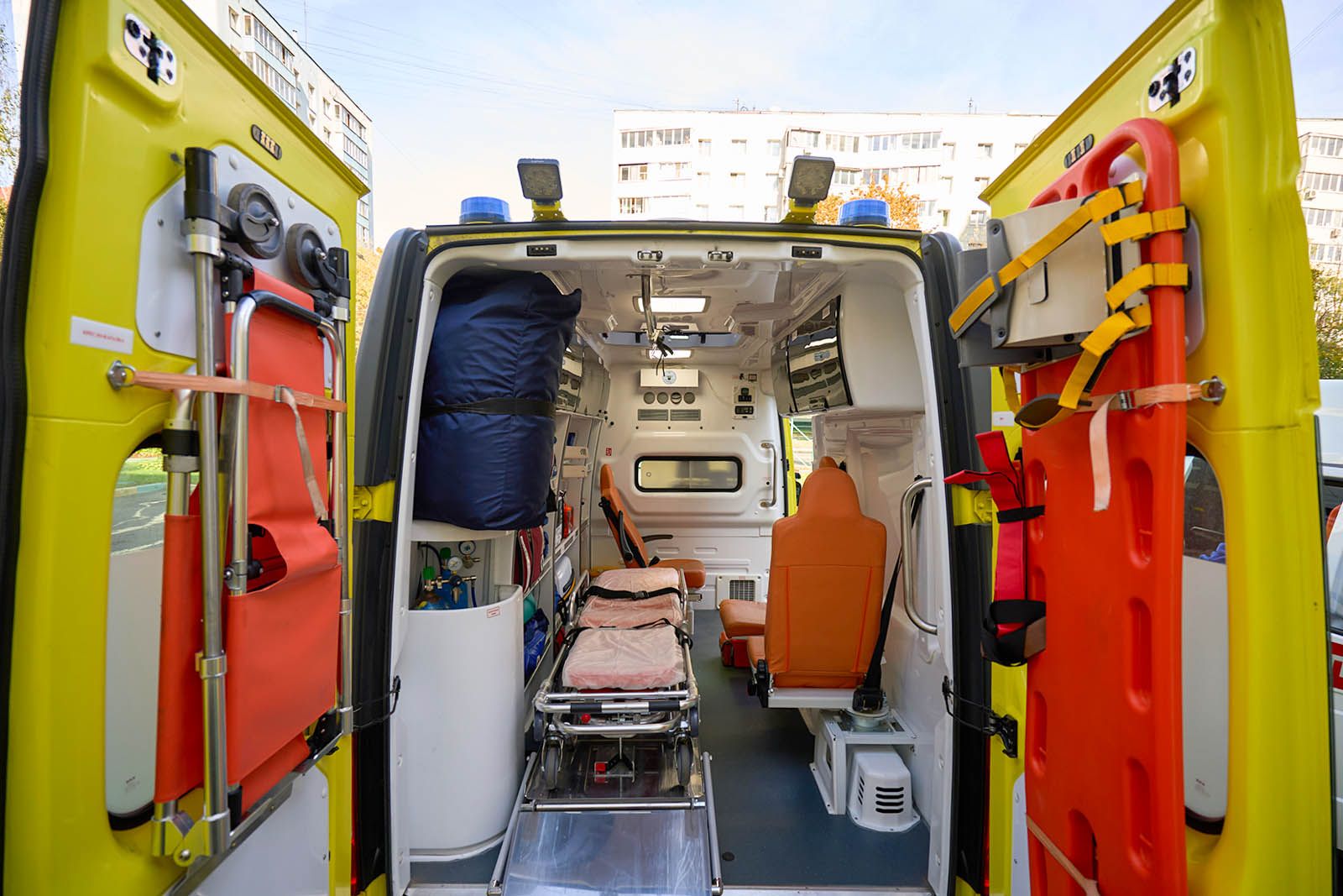 Новые машины, помимо всего прочего, оснащены пневмоподвеской, которая под напором воздуха приподнимает заднюю часть корпуса на 10 сантиметров: так носилки с пациентом удобнее завозить в салон. Всюду лампы — освещается каждая полочка.