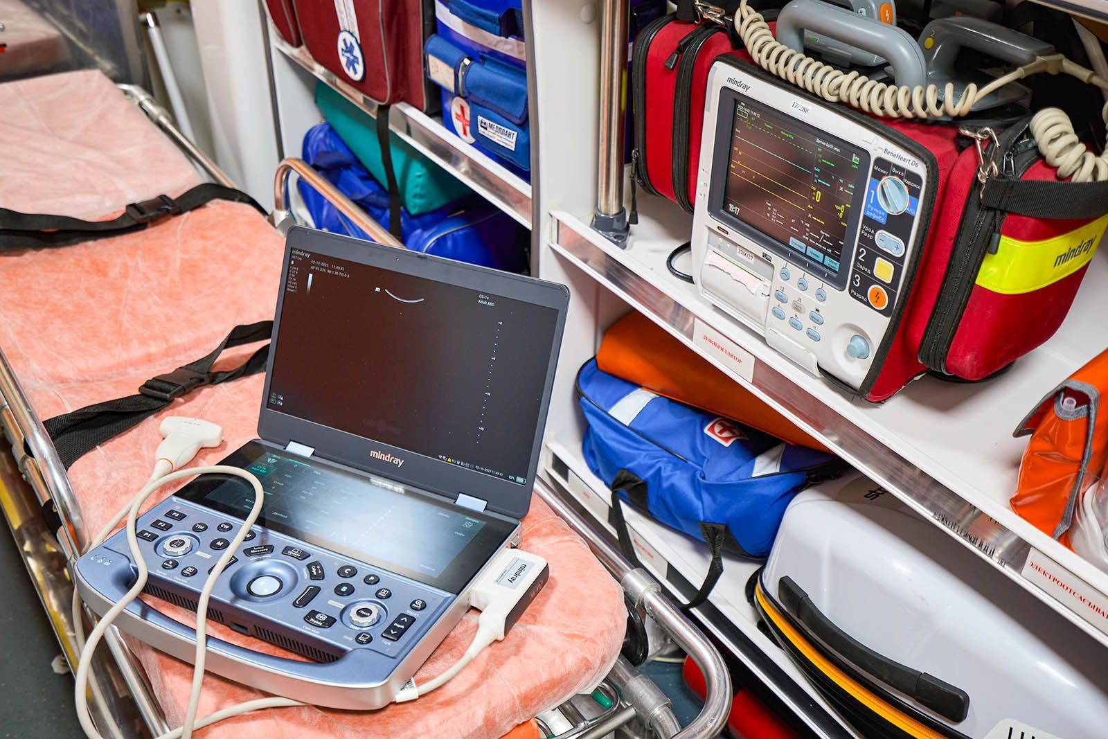Врач продолжает экскурсию по автомобилю. Вот шприцевой насос: можно по пути делать инъекции, а прибор сам будет дозировать лекарство. Вот чемоданчик, содержащий 100 препаратов и 60 инструментов. А вот компактный аппарат УЗИ, похожий на ноутбук: если у человека, например, подозревается внутреннее кровотечение, не нужно ждать, пока его довезут до больницы.