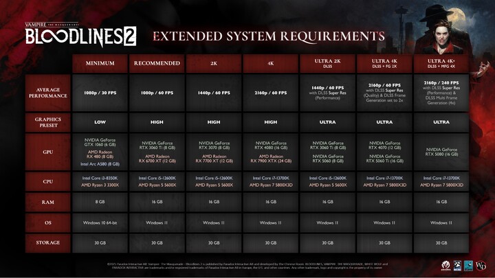 В это, конечно, трудно поверить, но кажется, что многострадальная вампирская ролевая игра Vampire: The Masquerade — Bloodlines 2 действительно готова и уже на следующей неделе выйдет. По крайней мере, разработчики пока что не объявили об очередном переносе. Зато выкатили системные требования, необходимые для вольготной игры в их нетленку.