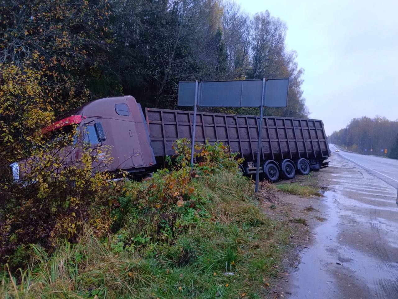 Грузовик, съехавший в канаву заметили на дороге Ржев – Старица, не доезжая до поворота в сторону города Зубцов. Фура с прицепом и установленным на нем контейнером съехала с дороги перед указателем в канаву и завалилась. Водителя на месте не оказалось.