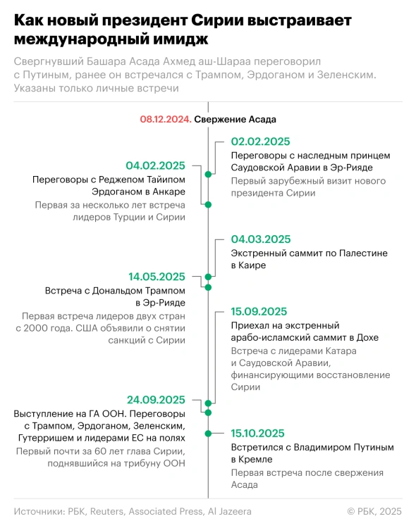 Аш-Шараа весной 2025 г. уже встречался с лидерами Турции, Саудовской Аравии, Франции и США, после чего ЕС и американские власти отменили часть наложенных на Сирию при Асаде санкций.